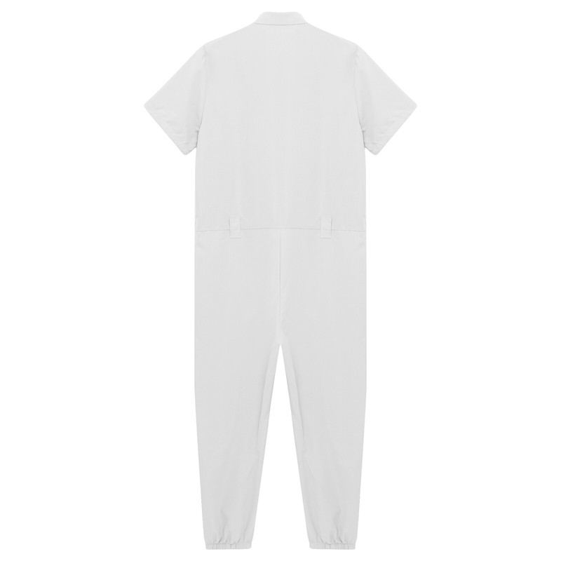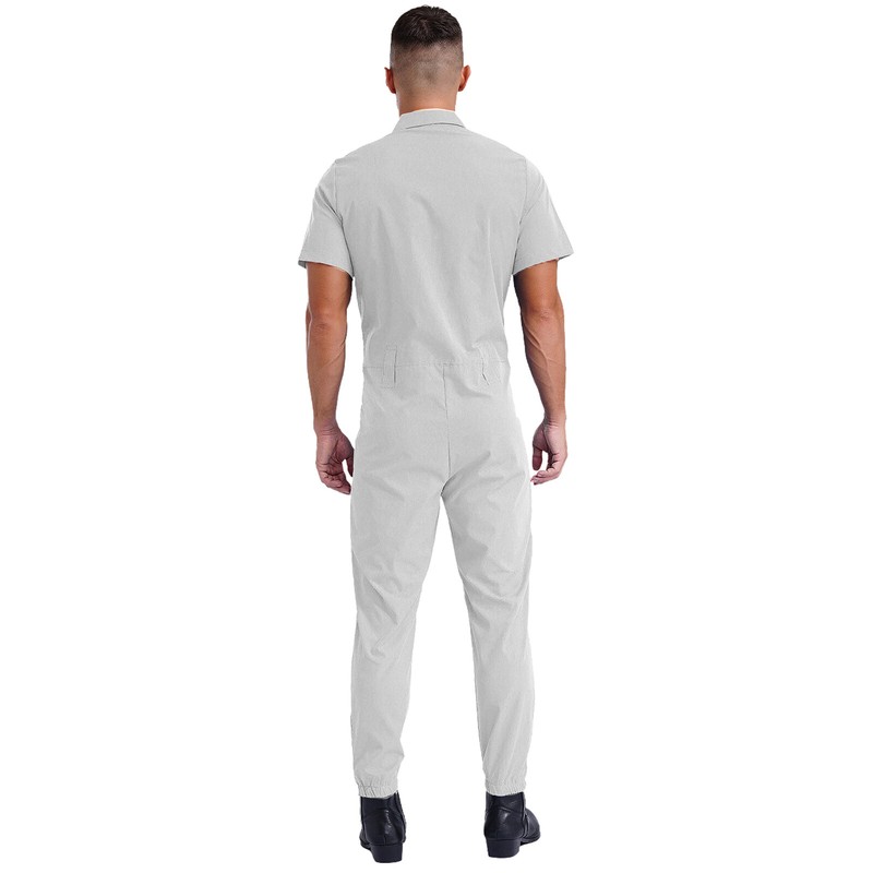 Designed with turn-down collar, short sleeve, front zipper closure, flap pockets, long pants with elastic opening, one-piece romper for men.