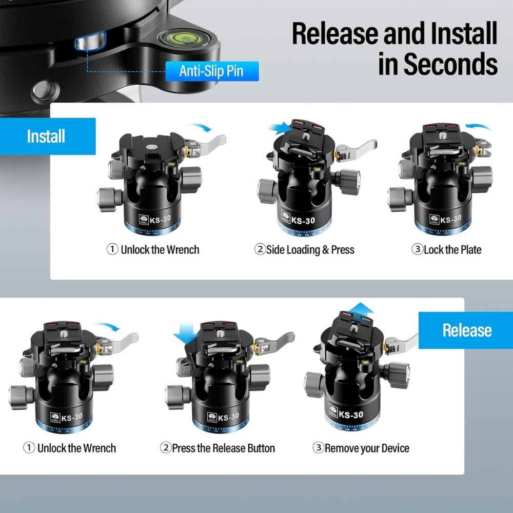 The KS-30 incorporates an Arca-type quick release set with a quick release flip-lock system to mount or remove equipment. The large flip-lock lever offers rapid one-handed operation. The included KS-55P panning Arca-type plate allows 360° camera rotation regardless of head position or if the head's panning base is locked.