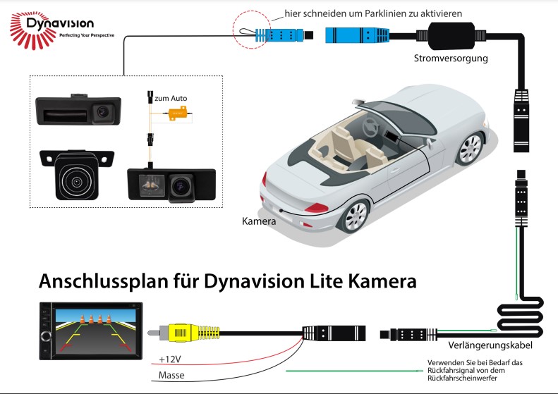 - rot: +12V geschaltet vom Rückfahrlicht oder Zündung oder Kamerastromversorgung vom Radio