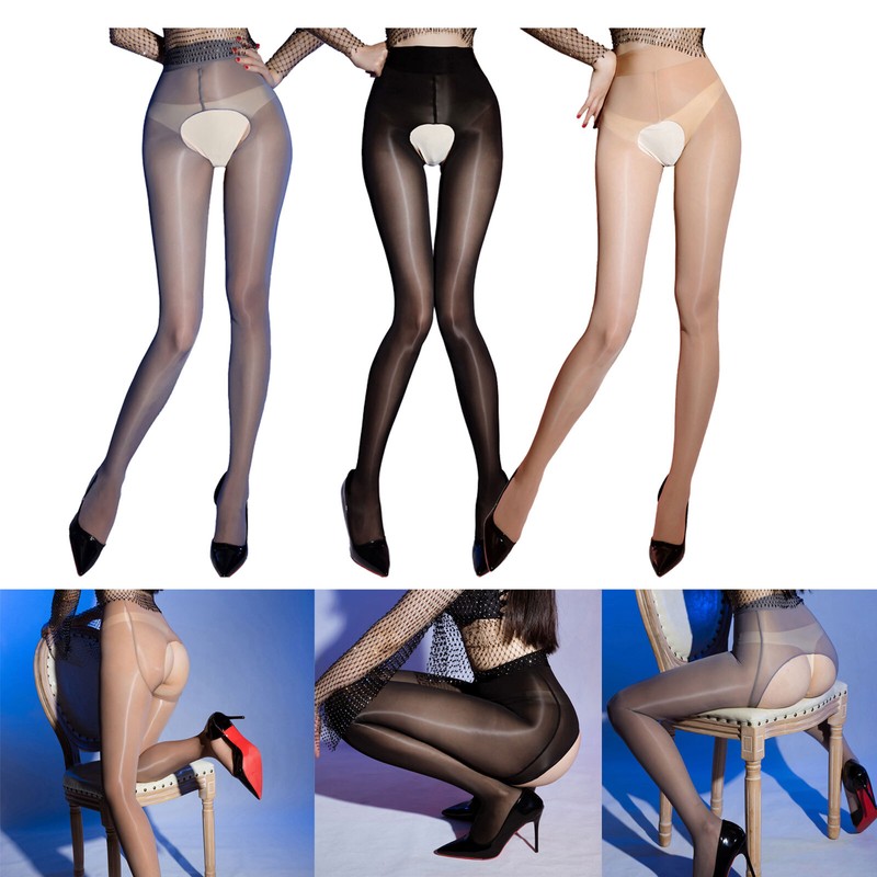 Womens Glossy Crotchless Pantyhose Smooth Mid Waist Tights Lightweight Clubwear