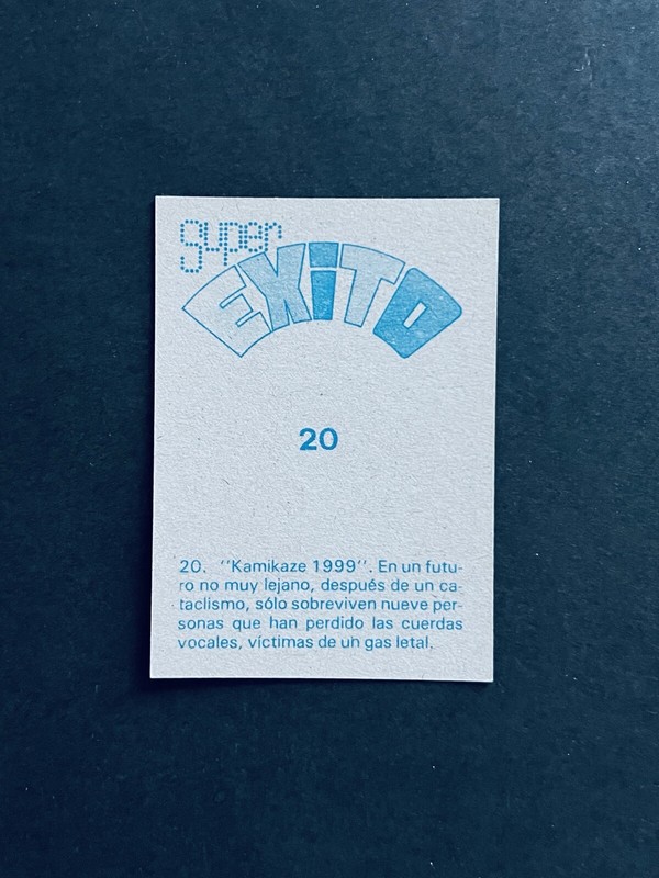 Dive into the action-packed world of Japanese cinema with this mint condition 1984 "Kamikaze 1999" movie card, #20 from the Super Exito series by Editorial Maga. This collectible card captures a thrilling scene from the film, showcasing the dystopian and explosive adventures that have enthralled fans of science fiction and action genres.