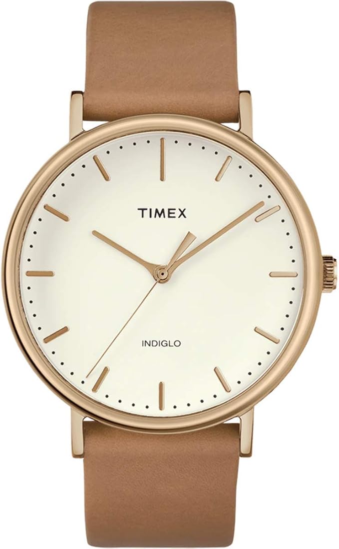 Timex Mens Fairfield 41mm Watch. Rose Gold-Tone Case. Tan Genuine Leather Strap.Beige dial.Quartz movement. Water Resistant 30 meters.