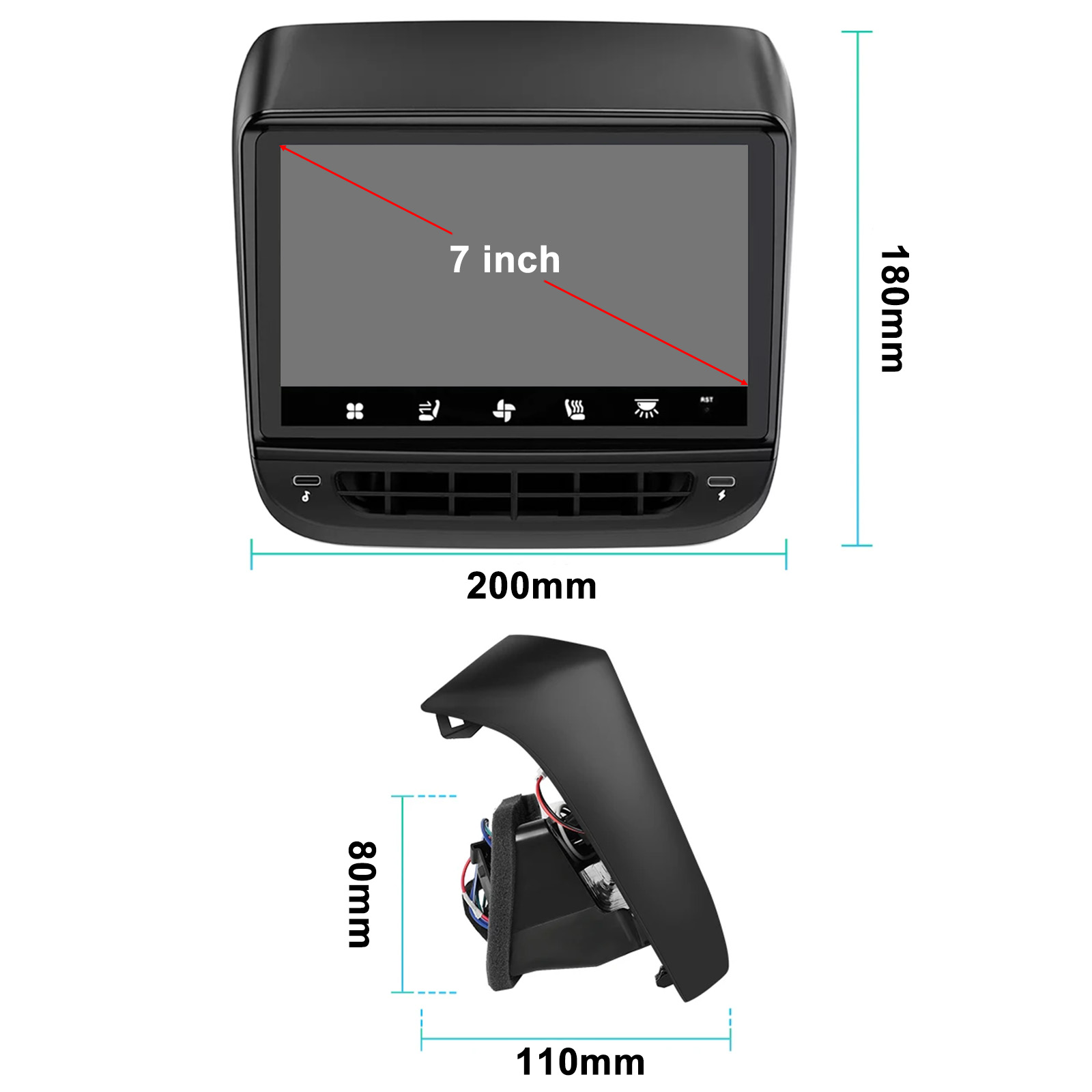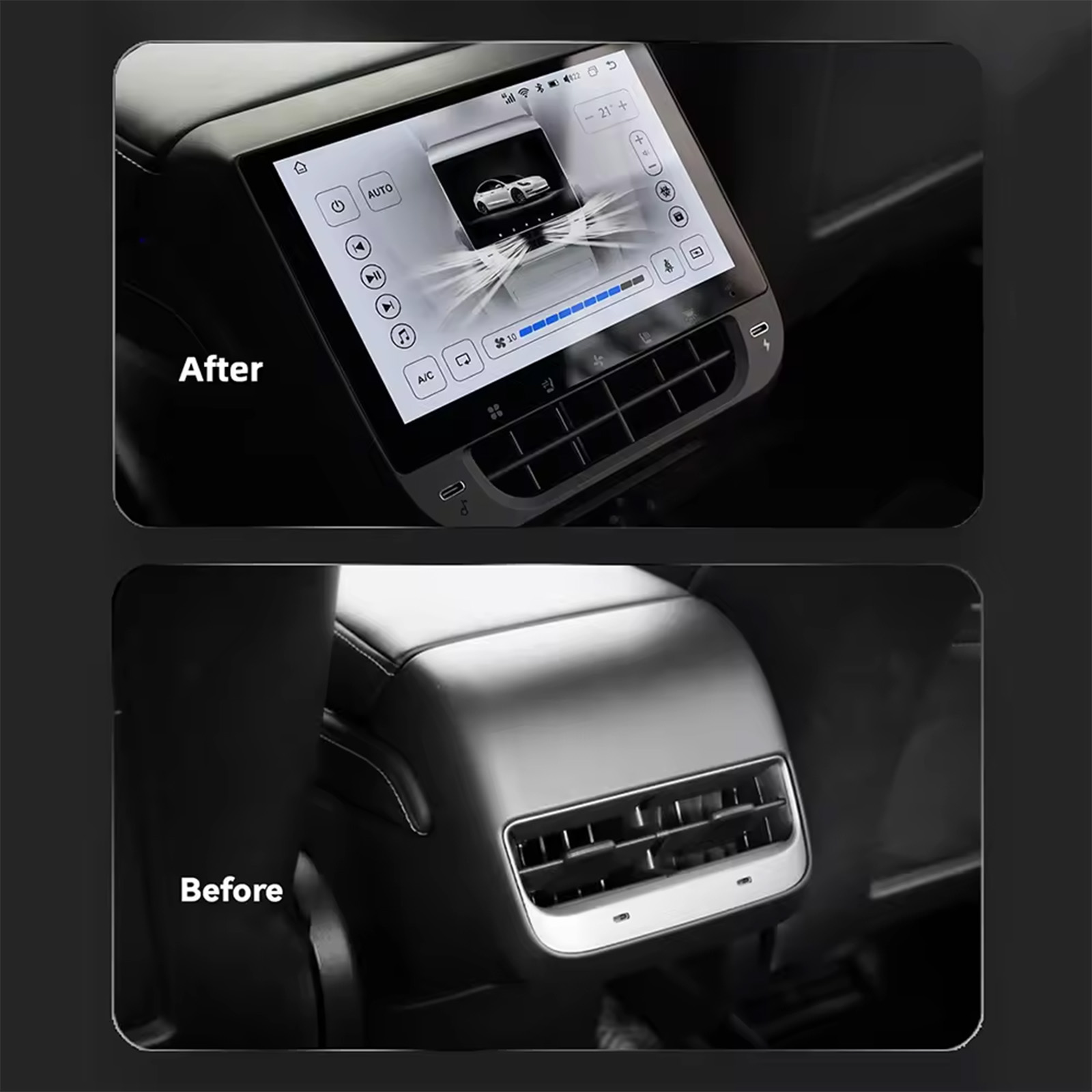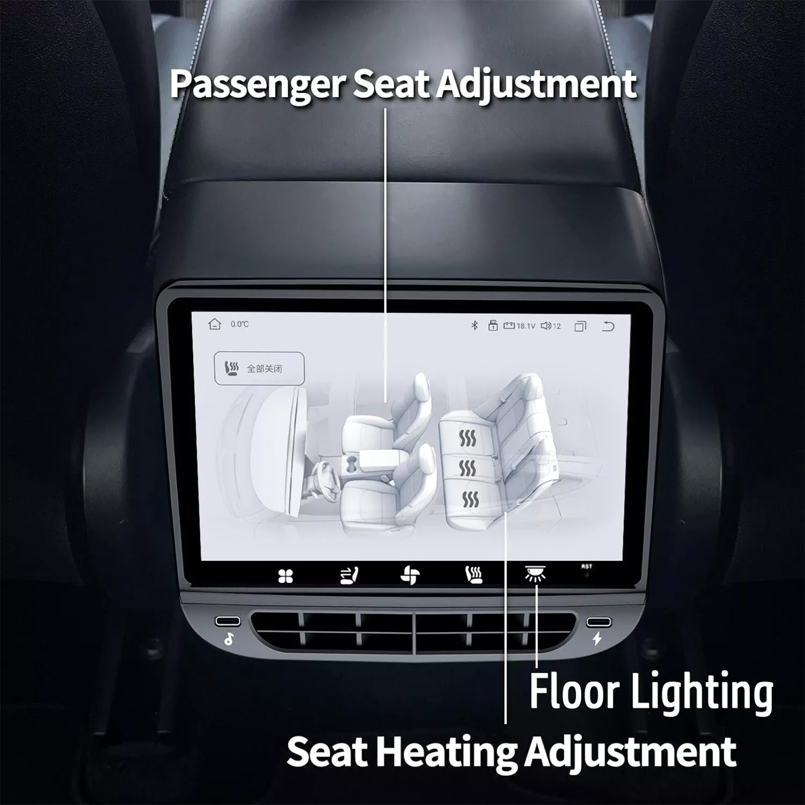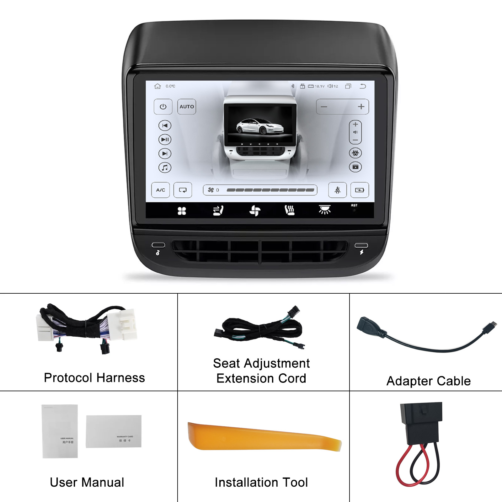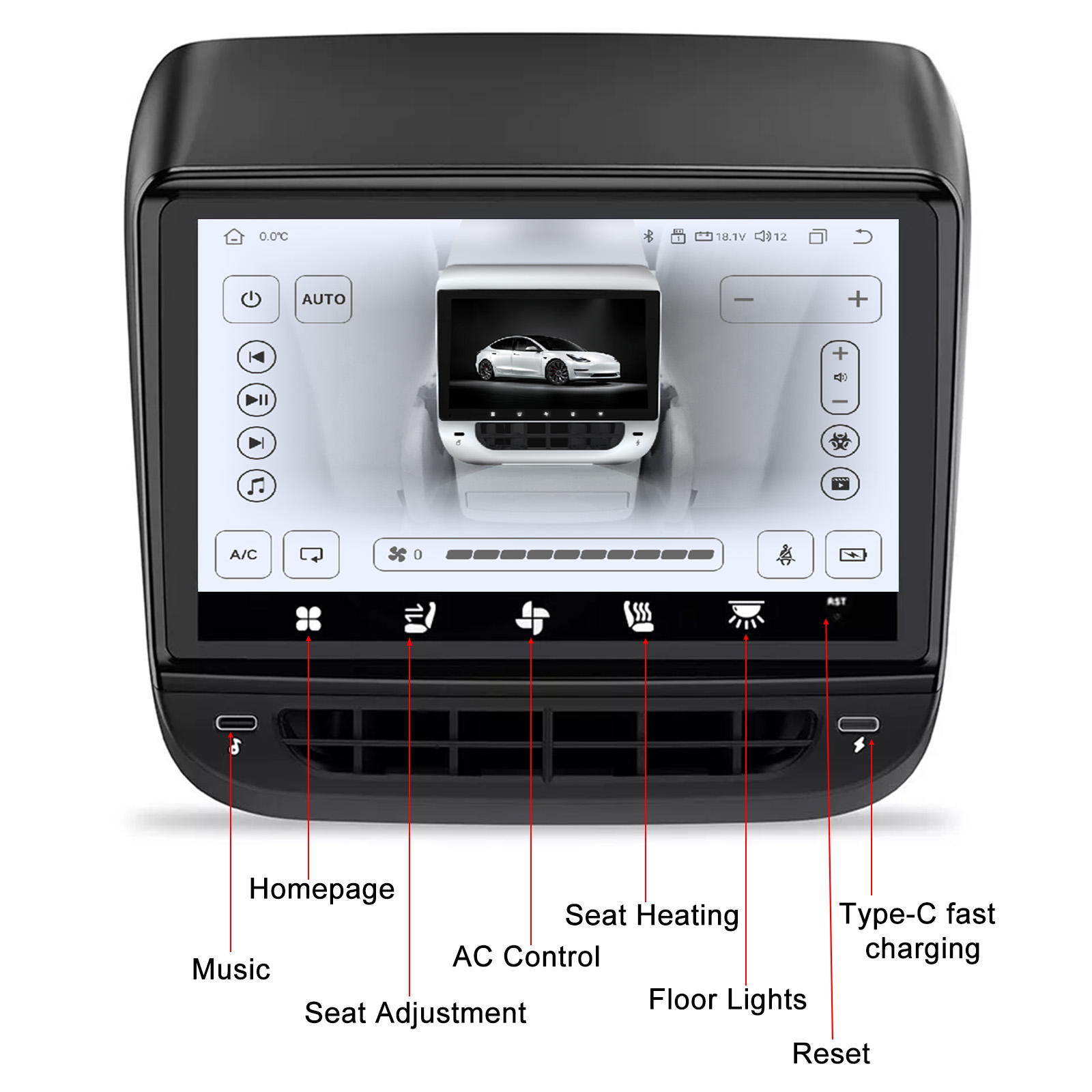 Diversified Functions: Through this rear display screen, we can realize the functions of air conditioning control, seat heating, atmosphere lamp control, internal and external circulation, Light, entertainment music & movie, 2 External C Port etc