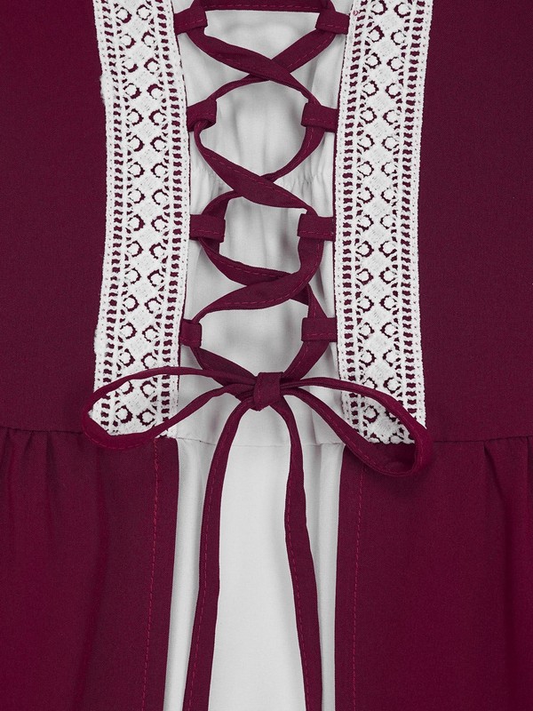 Square neckline with lovely trim, long flare sleeve, adjustable shoulder ties and back laces, front lace-up with lace, side zip-up.