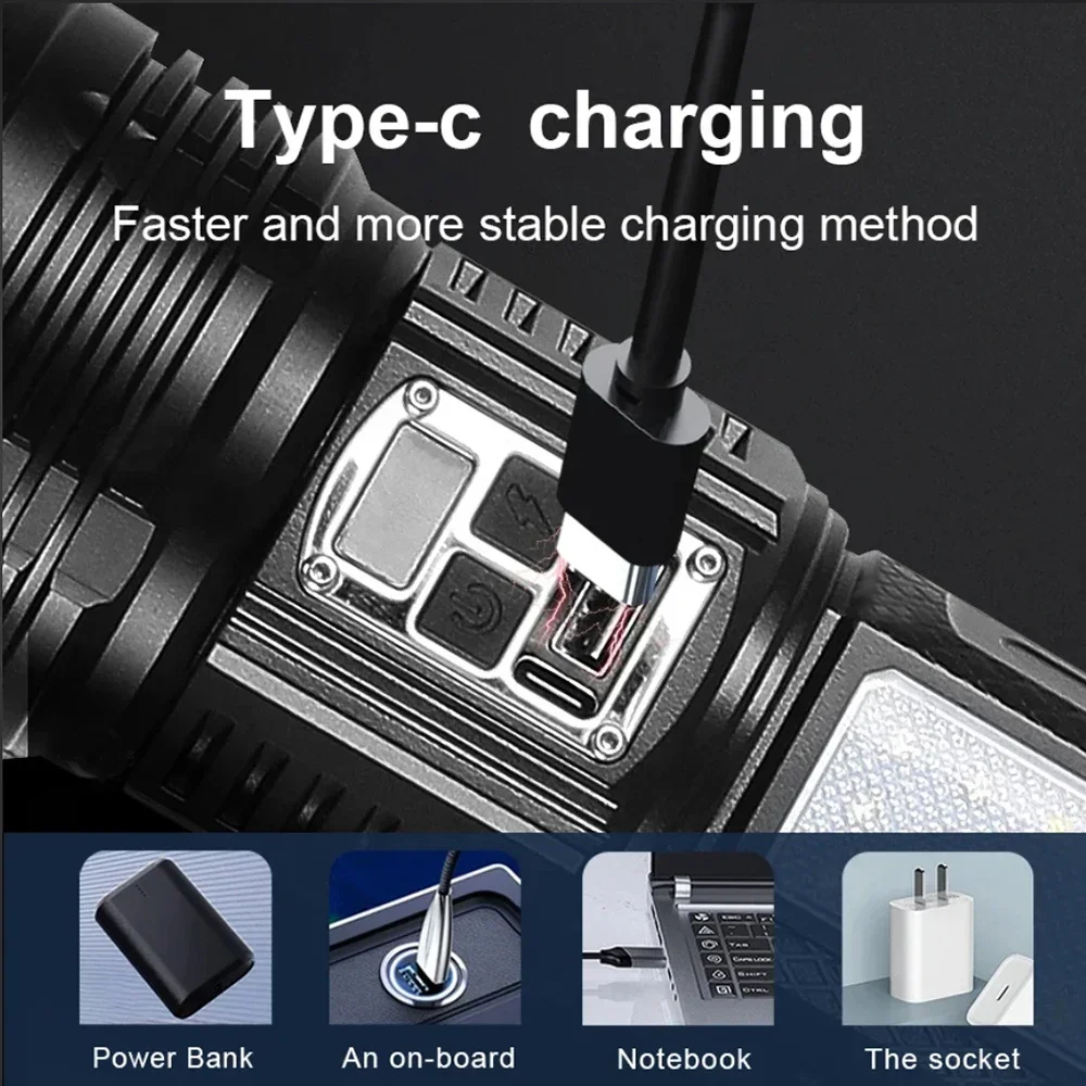 The latest long-range LED flashlight adopts the latest upgraded 1500W wick as the luminous point.upgraded on the basis of 1000W wick, with a brightness increase of 150%, ultra long range focusingretractable zoom, and illumination of 5km, The fashlight adonts a high-power lED flashlight with a built-in15000mAh high-capacity battery, which greatly extends its service life after the new upgrade and can beused continuously for up to 26 hours. Newly upgraded with two buttons, the left button controls the1 500W main light and the right button controls the COB side light, making it more convenient to useEquipped with a battery level display, you can always know the remaining battery level. When using a C-type fast charger for charging, the charging speed is twice that of a reqular charger, making it a must-havefor outdoor activities and a small helper for families.