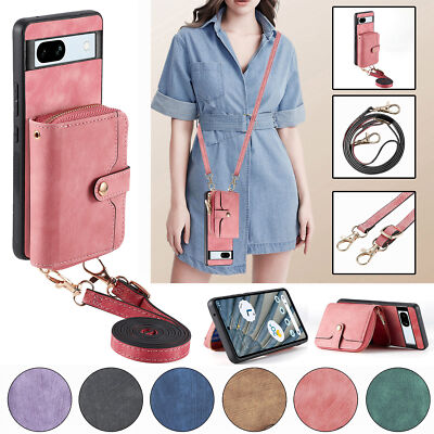 For Google Pixel 7a/7 Pro/6a Luxury Wallet Case Zipper Card Slots Shoulder Strap