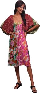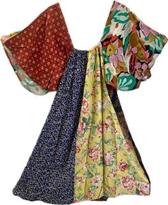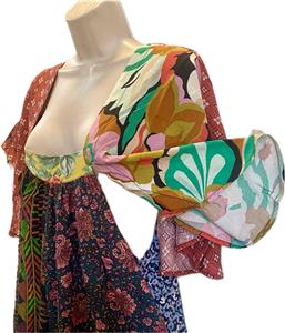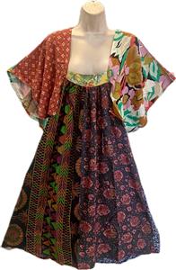 Artsy clothing for expressive women! Presenting classic gypsy hippie chick bohemian shabby chic styles for creative women. Handmade boutique styles at affordable prices. 100% Rayon no match patchwork peasant festival dress featuring dramatic angel sleeves. The sleeves create the look of a little capelet over a sleeveless dress. There is a little elastic in the back. This dress has a really nice cut and excellent drape. It will soon become one of your favorite styles from Sacred Threads! The model is just to show what the item looks like on but the dress hanging in the separate picture is the exact one you will receive. This dress would look great with black leggings or as is. Very versatile. Check the measurements below.