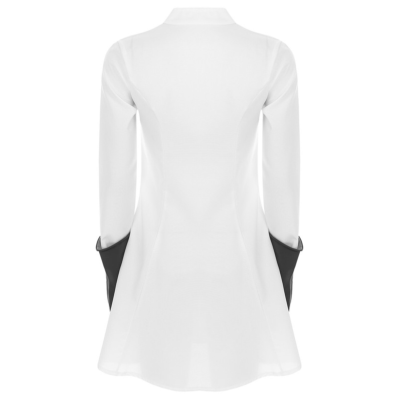 Package includes a lab coat and a pair of rubber gloves. Lab coat is designed with stand collar, long sleeve, side button-up and flared hem.