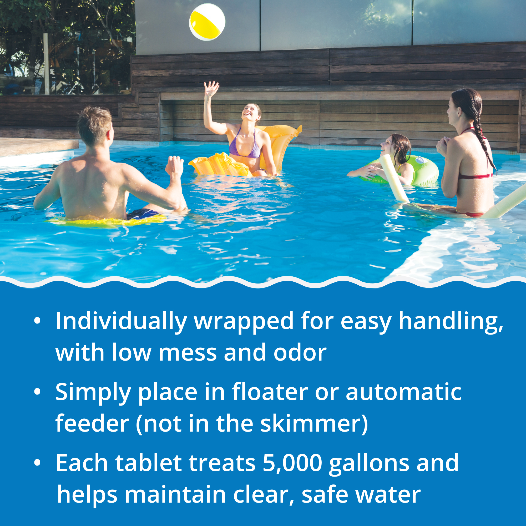 In The Swim pool chlorine tablets are very effective and easy to use but should not be put into the skimmer basket unless your pump runs 24/7; instead place chlorine tablets into a chlorine floater or automatic chlorine feeder. Use enough tablets to maintain a consistent chlorine level of 1.0 - 2.0 ppm, as verified by your pool test kit or strips. Each slow-dissolving chlorine puck adds 5.5 ppm of chlorine per 10,000 gallons over several days. Most pools use about one 3” tablet for every 5,000 gallons of pool water, replaced every 5-7 days. Pool chlorine tablets dissolve into your pool water to kill algae, bacteria, and other organic contaminants.