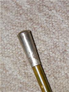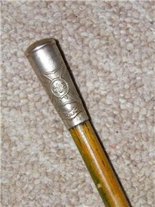 This swagger stick has a nickel silver top, displaying an intricate crest reading