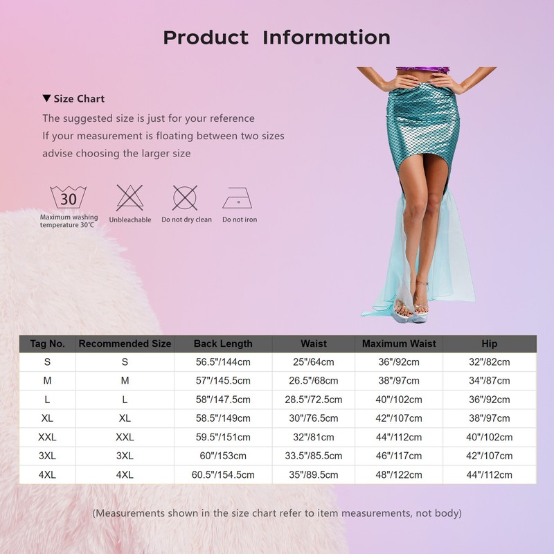Suitable for Halloween, stage performance, photography, dress-up party, masquerade, festivals, carnivals, water park performance and so on.Size Chart: The suggested size is just for your reference. If your measurement is floating between two sizes, advise choosing the larger size. (Measurements shown in the size chart refer to item measurements, not body)