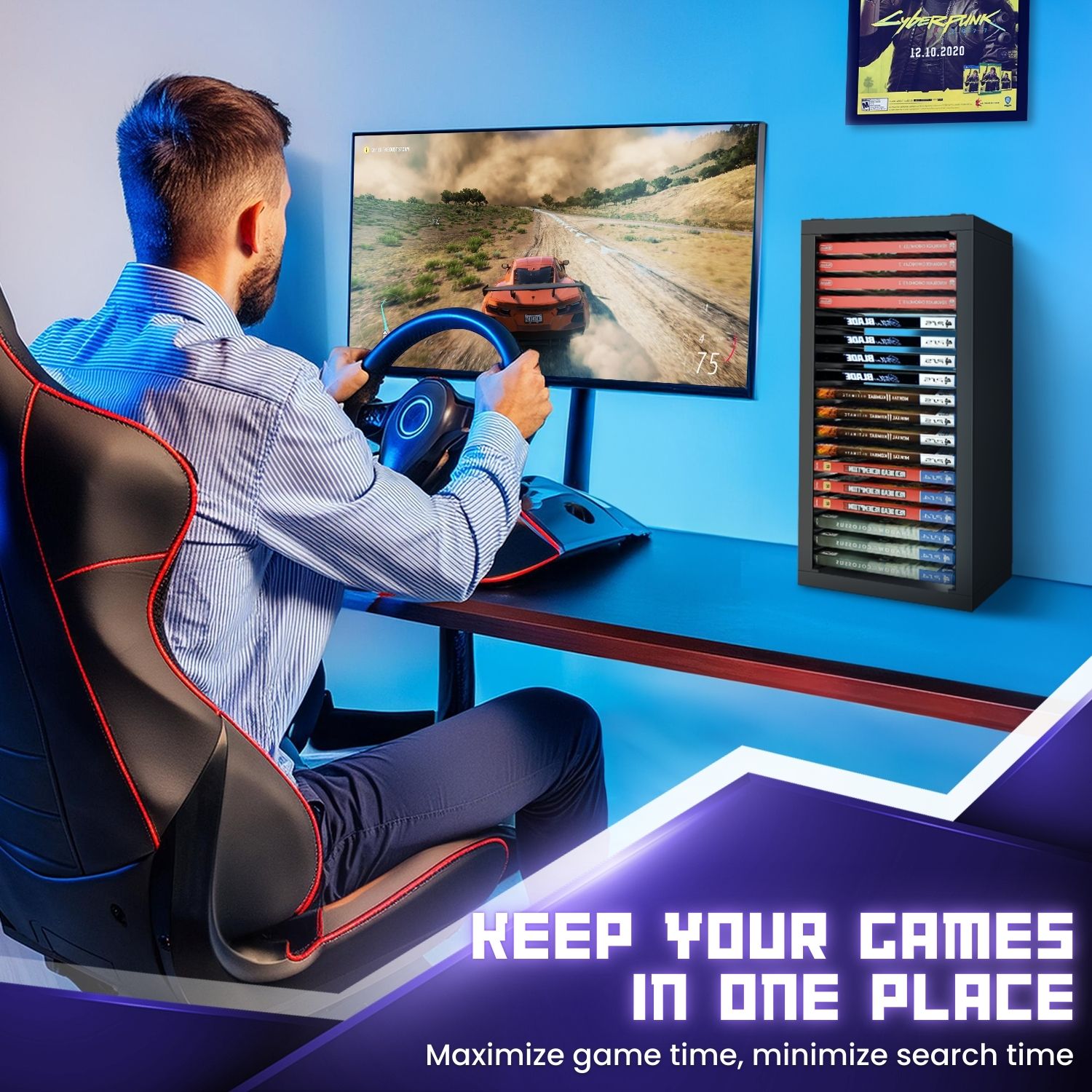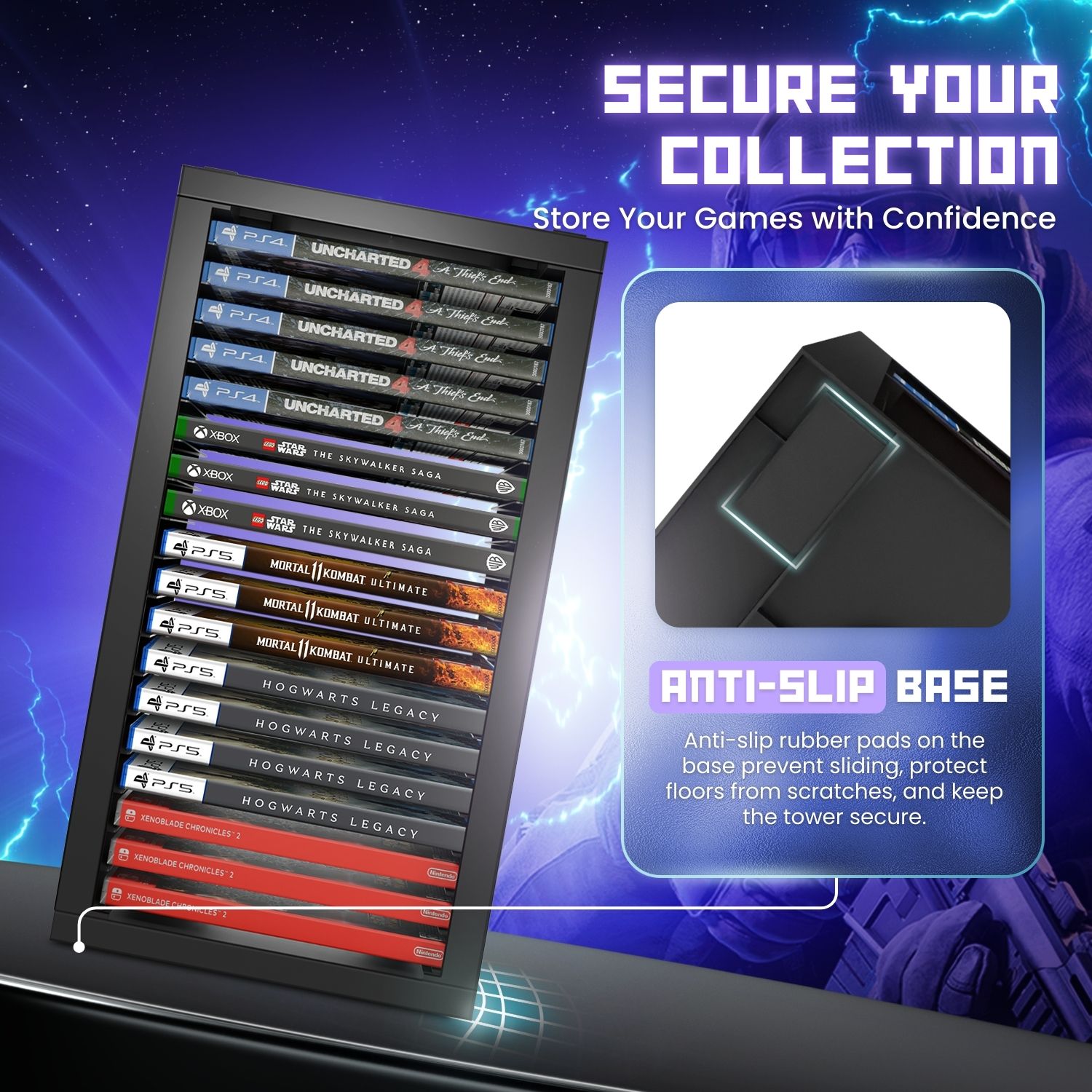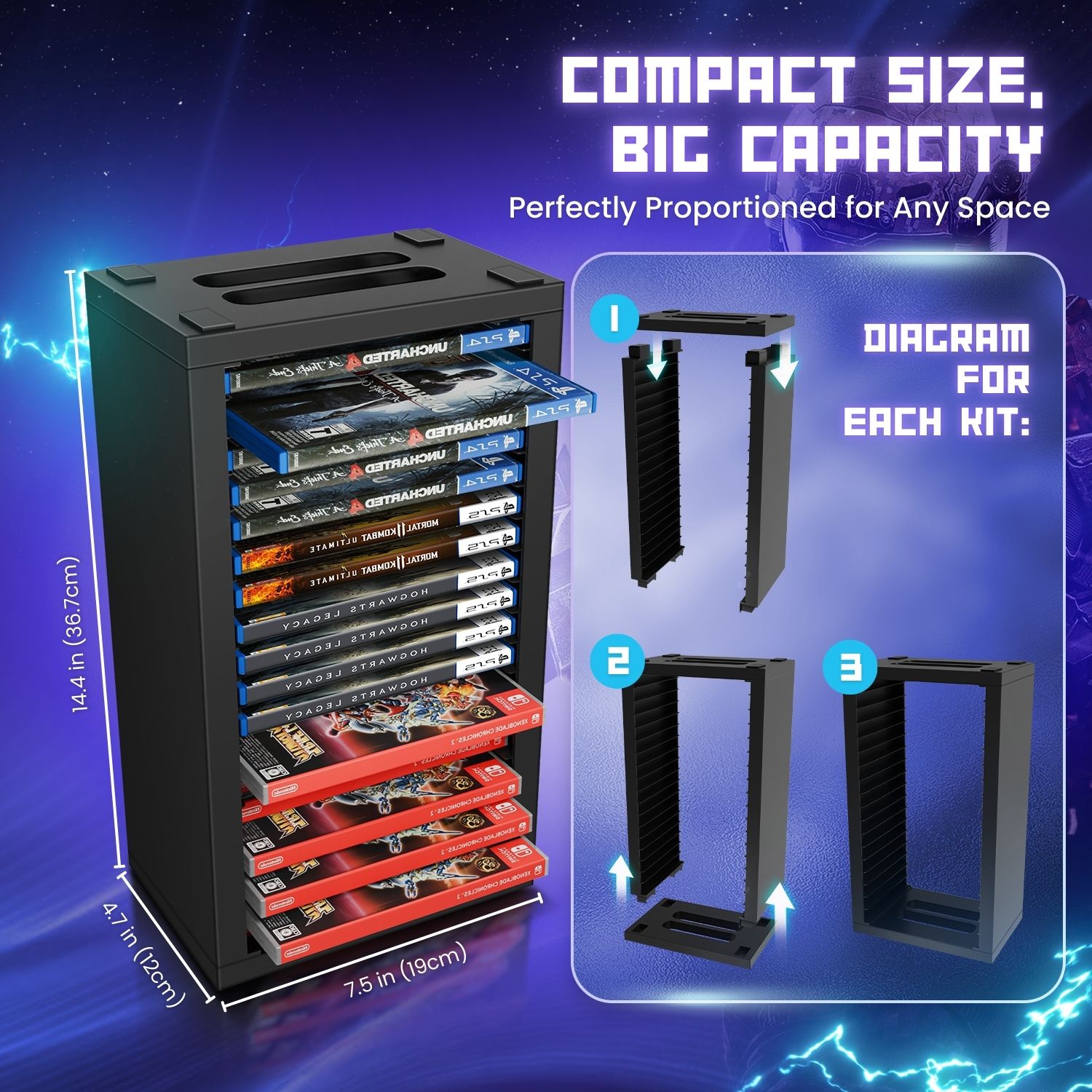 Dive into an organized and stylish gaming experience with the TNP Universal video game organizers and storage tower, a versatile storage solution compatible with PlayStation 5, PlayStation 4, PlayStation 3, Nintendo Switch, Xbox Series X, Xbox Series S, Xbox One and Blu - Ray Disc, accommodating up to 18 disc cases. This sleek gaming storage tower, measuring 28.9 x 7.5 x 2.7 inches, offers generous storage in a compact design, fitting perfectly into any entertainment area. Inspired by the PS5 theme, this game holder rack for PS5 enhances your gaming space's aesthetic while keeping your collection organized and accessible. Ideal for growing game libraries, this video game stand tower is expandable with additional units for a custom display, side-by-side or stacked. Its effortless assembly process, requiring no special tools, allows you to set up your gaming sanctuary in minutes. Elevate your gaming area with this elegant, space-efficient organizer and proudly showcase your gaming passion. Order your TNP Gaming Disc Tower today and transform your gaming space into a sleek, organized haven for your cherished collection.Feature: