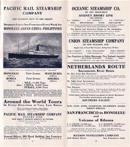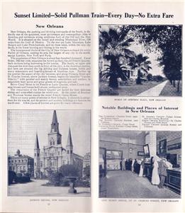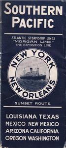 The Southern Pacific Railroad and Atlantic Steamship Lines operated a sea-rail passenger link between New York City and New Orleans for many years. Passengers would board steamships in New York, sail down the Atlantic Coast and around Florida to New Orleans, where they could connect to SP trains to California or other southwest points. For auction is an extremely rare timetable/brochure promoting this service. It is dated June 1915. The brochure includes a schematic of the steamship, a map of its route, and information about life on-board. There are rail schedules from New Orleans to Los Angeles, San Francisco, and other western destinations. It includes information about steamship connections to Havana, Cuba; Japan; China, the Philippines; Panama; Honolulu; Australia; New Zealand; and others.