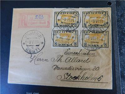 ESTONIA, 2 PAIRS OF SCOTT# 35 ON REGISTERED COVER TO STOCKHOLM, 1921. (actual item in scan). Please submit payment within 5 days of auction. Please visit our eBay store to find additional items for sale at fixed prices. You can get to our store by clicking on the red stores icon next to our name at the top of this page. To return to our store, you may wish to bookmark it your favorite places. All covers and stamps etc. are protected with hard cardboard and usually mailed within 48 hours of payment. Any questions please email me, happy bidding. Please understand that we are not the Post Office and we have no control over the mail or its delivery times. If for any reason you are not satisfied with your purchase or with our service, do not hesitate to e-mail us. Neutral and negative feedback should be a last resort for both the buyer and the seller. 9-5-24