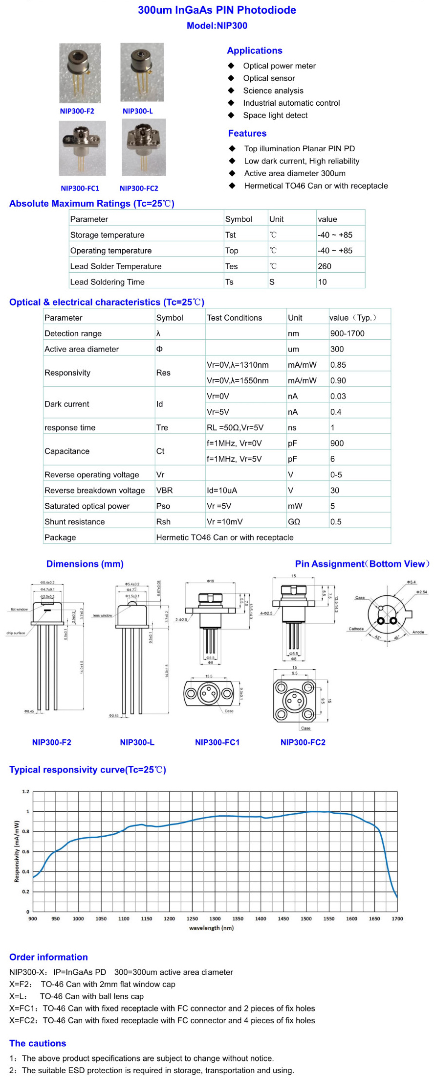 | Specifications: | Response wavelength range: 900-1700 nm Indium arsenide (material: indium gallium arsenide) Photographic surface diameter: 300um Typical responsivity: 0.85 mA/ mW@1310 nm,0.9 mA/ mW@1550nm |