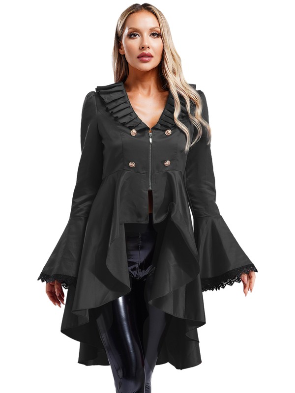 Designed with v neck, long sleeve, flared cuffs with floral lace trim, front zip-up and button decorations, ruffled trim and tailcoat silhouette.