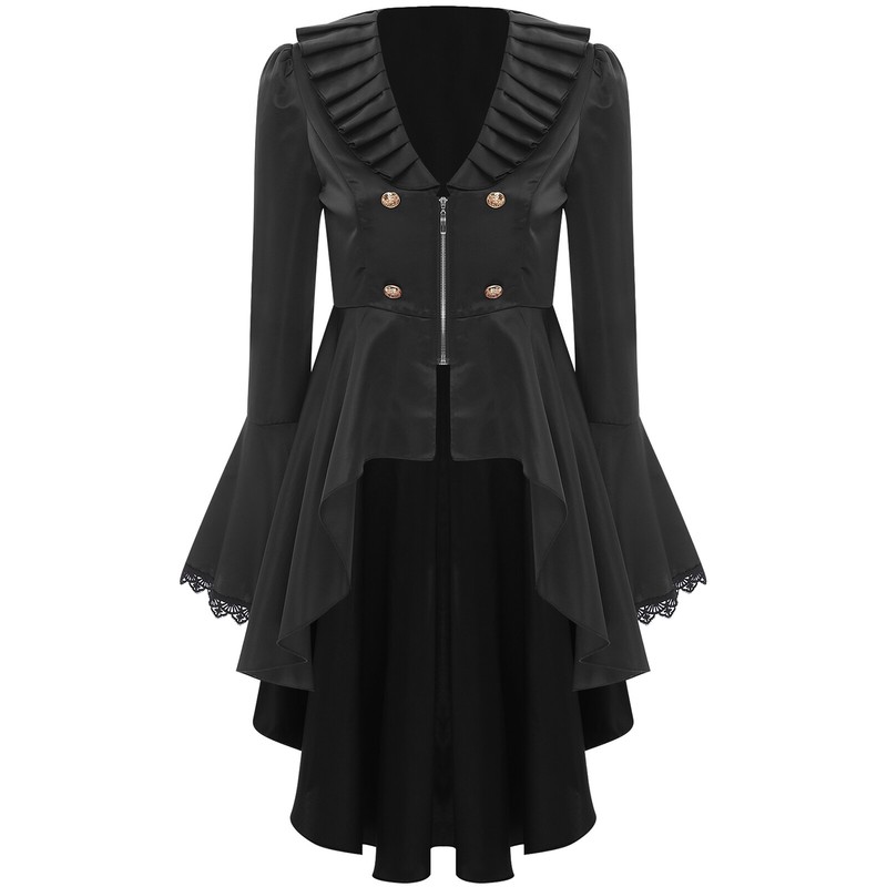 Ruffled trims, vintage metal buttons, floral lace trim and tailcoat design create a vintage gothic style, bringing you back to the medieval age.