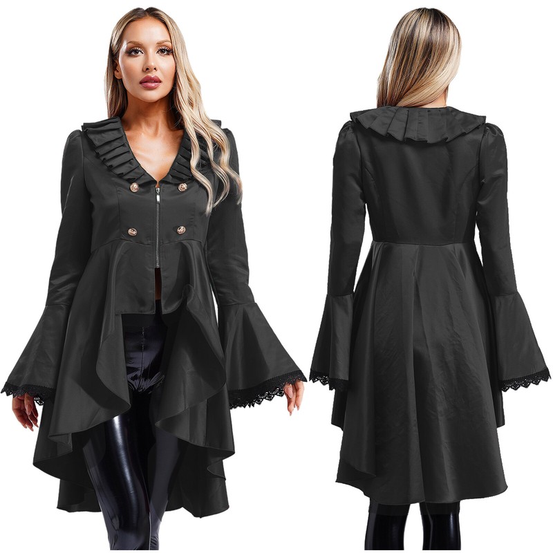 Designed with v neck, long sleeve, flared cuffs with floral lace trim, front zip-up and button decorations, ruffled trim and tailcoat silhouette.
