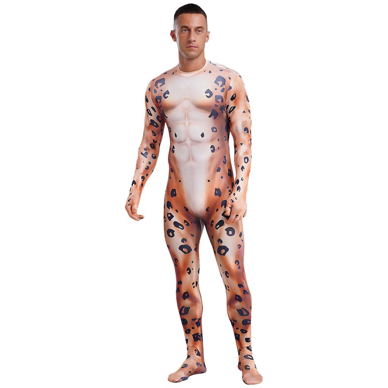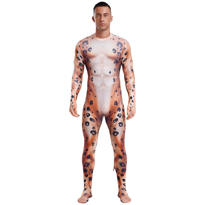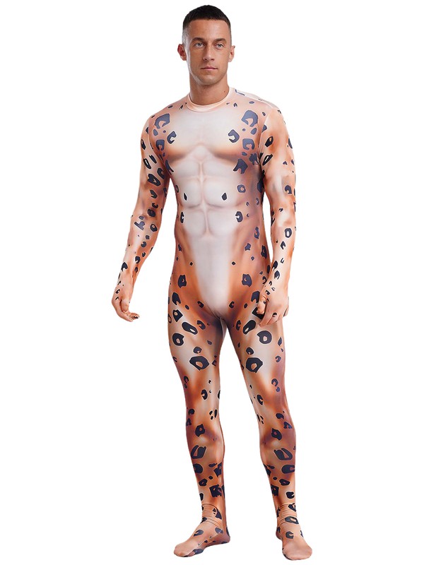 Full-body bodysuit is designed with stand collar, gloved long sleeve, 3D printed pattern, padded tail, footed and back zipper closure.