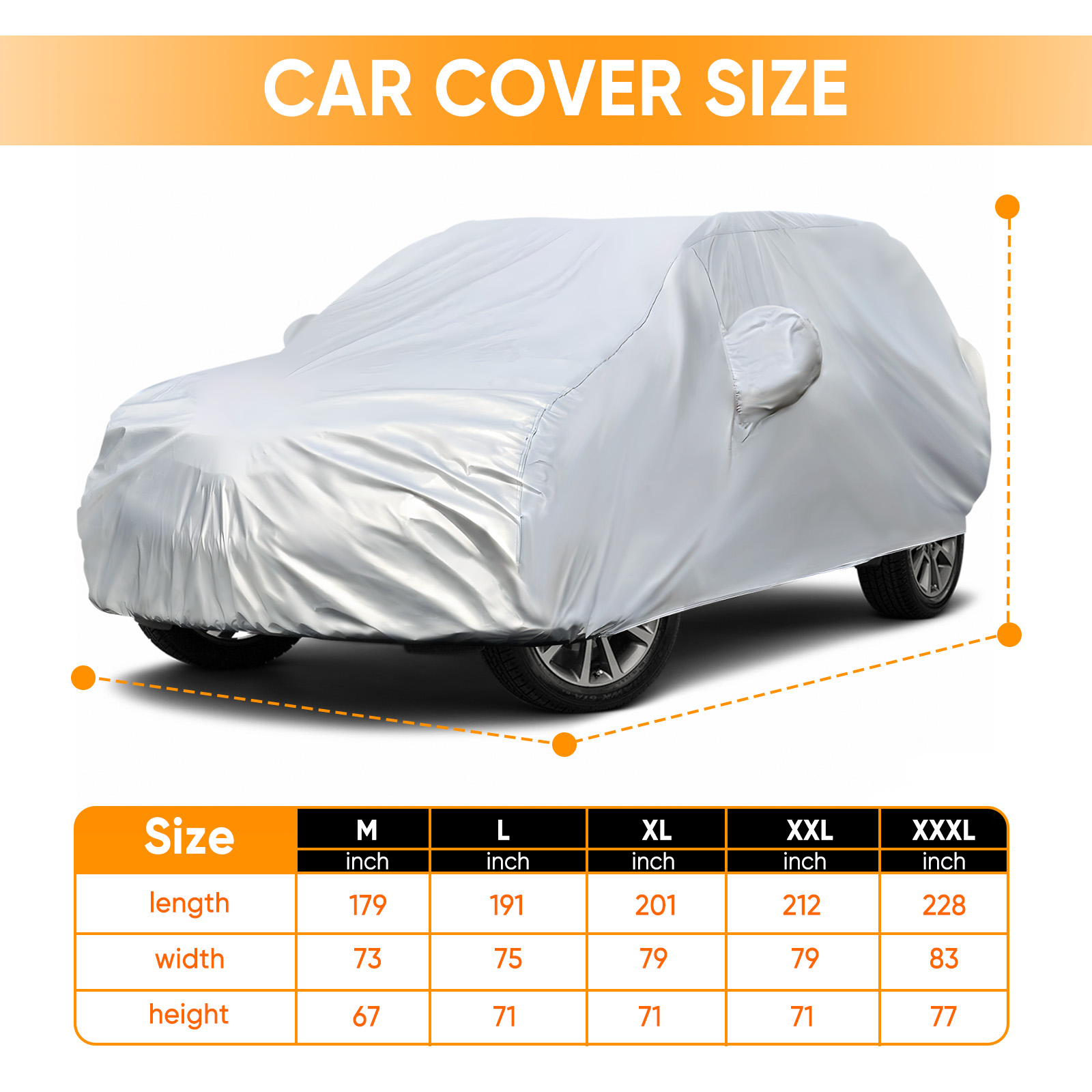 【Universal Fit for SUV】---Car Cover size : M(455 x 185 x 170cm); L(485 x 190 x 180cm); XL(510 x 200 x 180cm); XXL(540 x 200 x 180cm); XXXL(580 x 210 x 195cm);M-XXXL Car cover SIZE fit most SUV. Please Measure Your Car's Length First.
