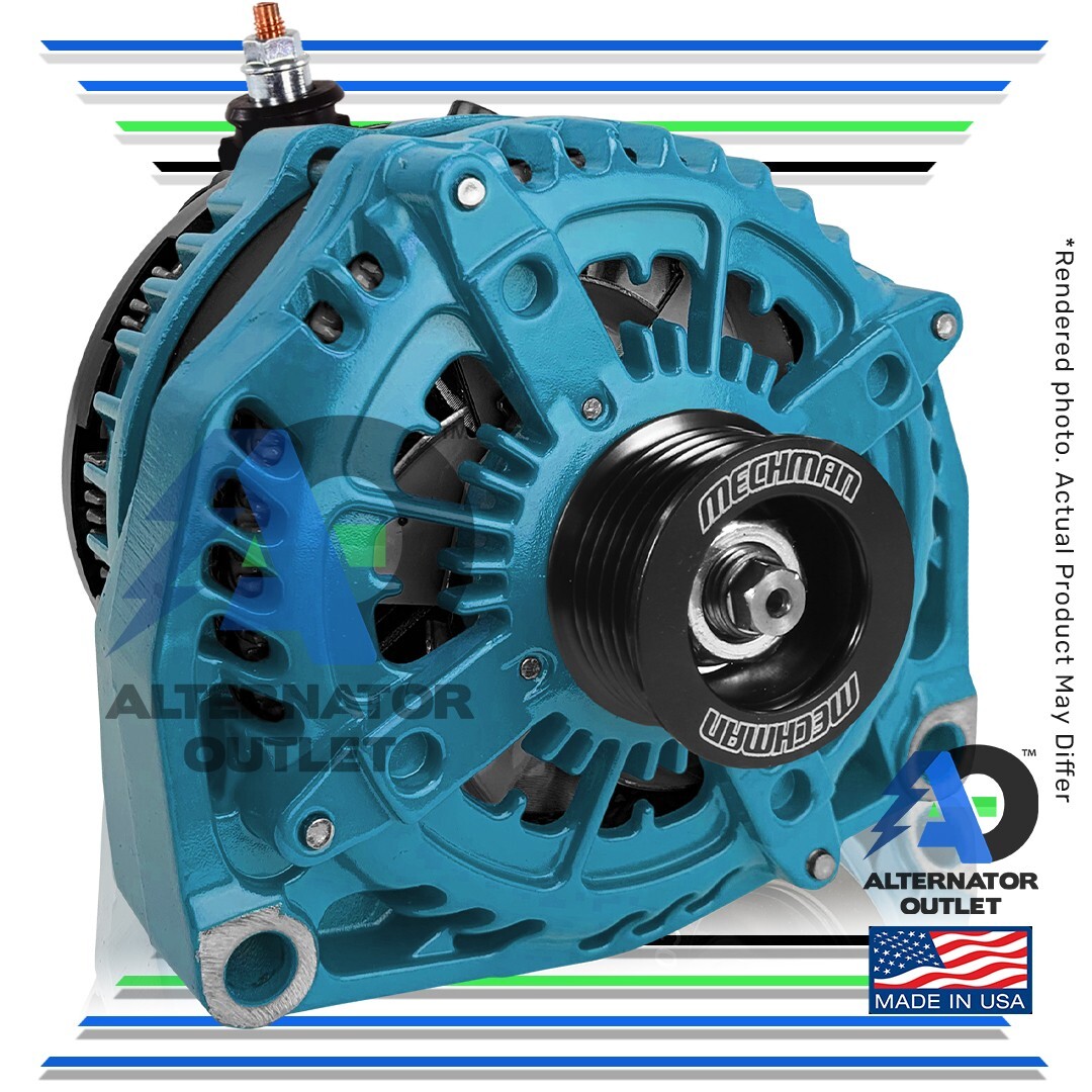 This Mechman 400 Amp alternator is custom made to order with the following custom color: Duplicolor Paint Code (High Temp. Engine Enamel): 1643 Torque N Teal Engine. Please note, lead time is 5-7 business days for this to be built and shipped.