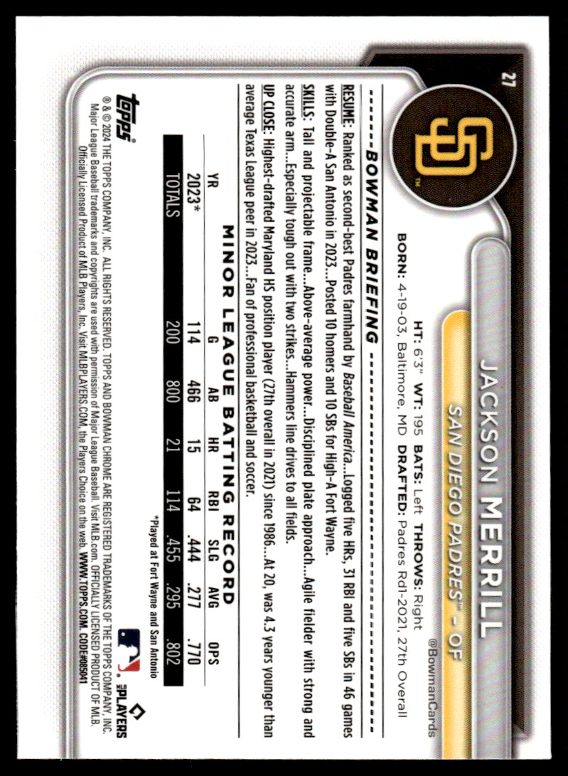 | 2024 Bowman Chrome Jackson Merrill San Diego Padres #27 |