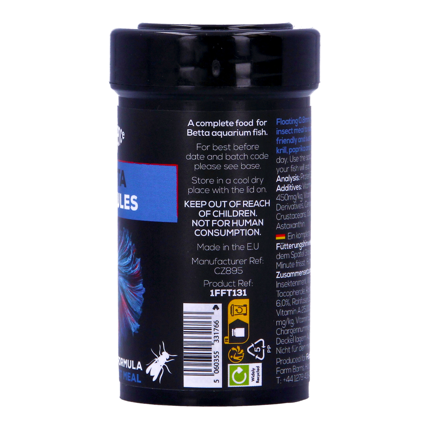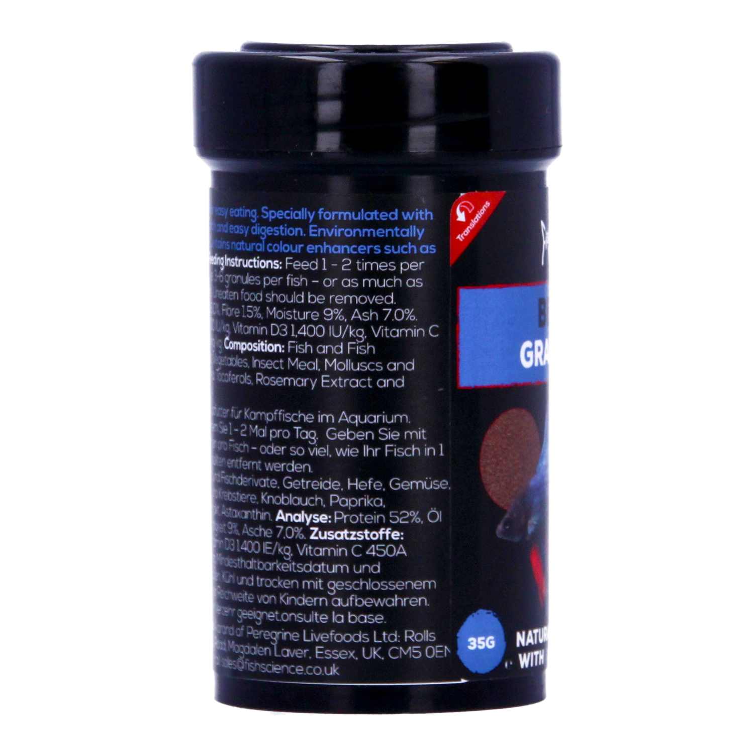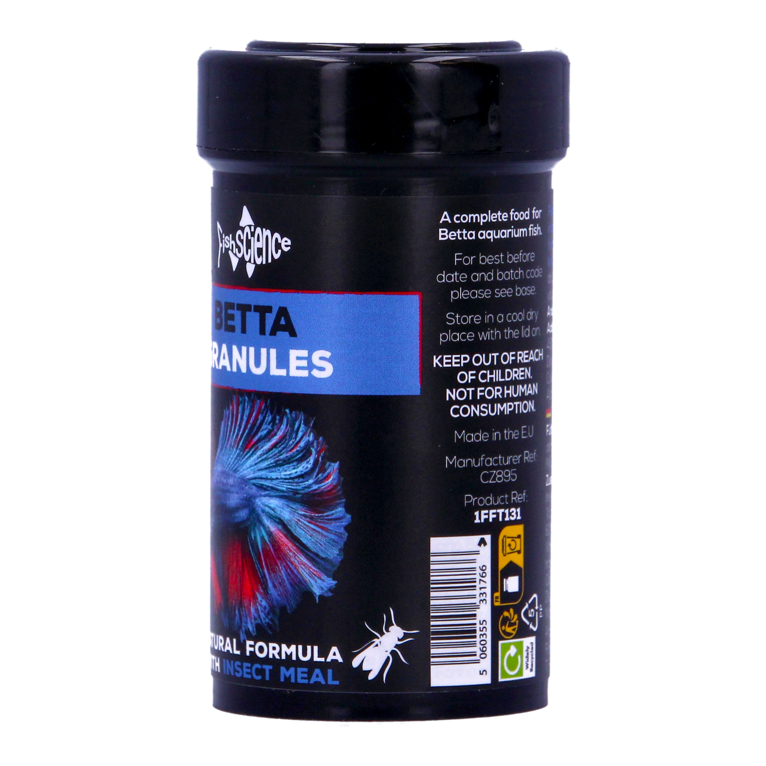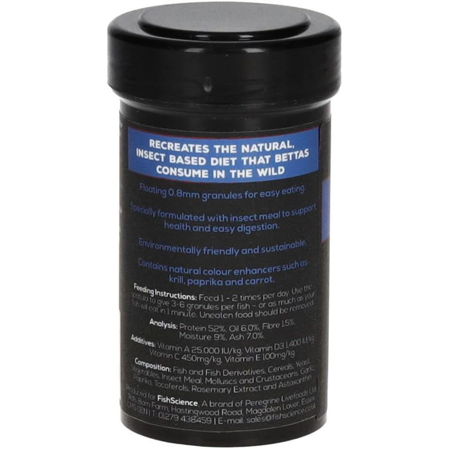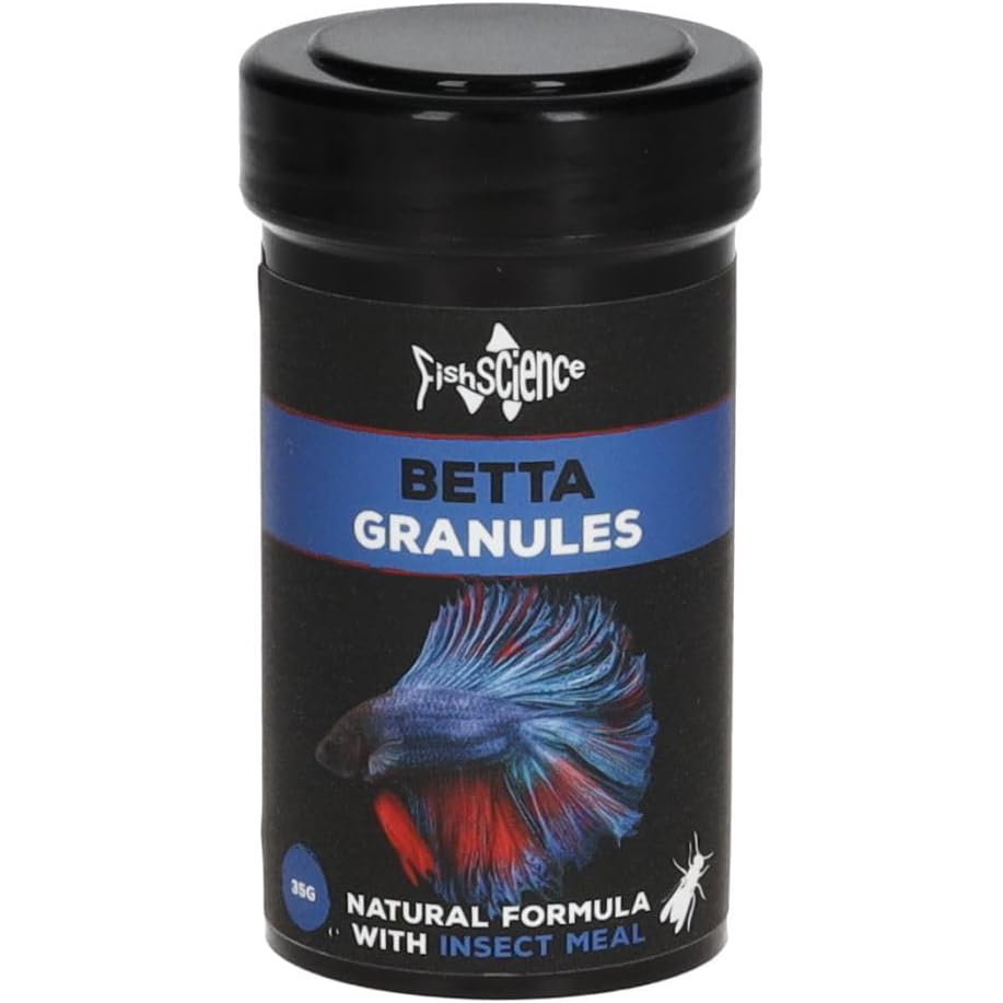 Fish Science Betta Granules are specially formulated floating granules designed to meet the dietary needs of bettas and gourami. Packed with insect meal for easy digestion and nutrient absorption, this food also includes Spirulina algae, carrot, paprika, and shrimp to naturally enhance color and promote healthy growth. By replacing traditional fish protein with eco-friendly insect meal, this food supports a natural diet for your fish, improving digestion, reducing waste, and ensuring better water quality.