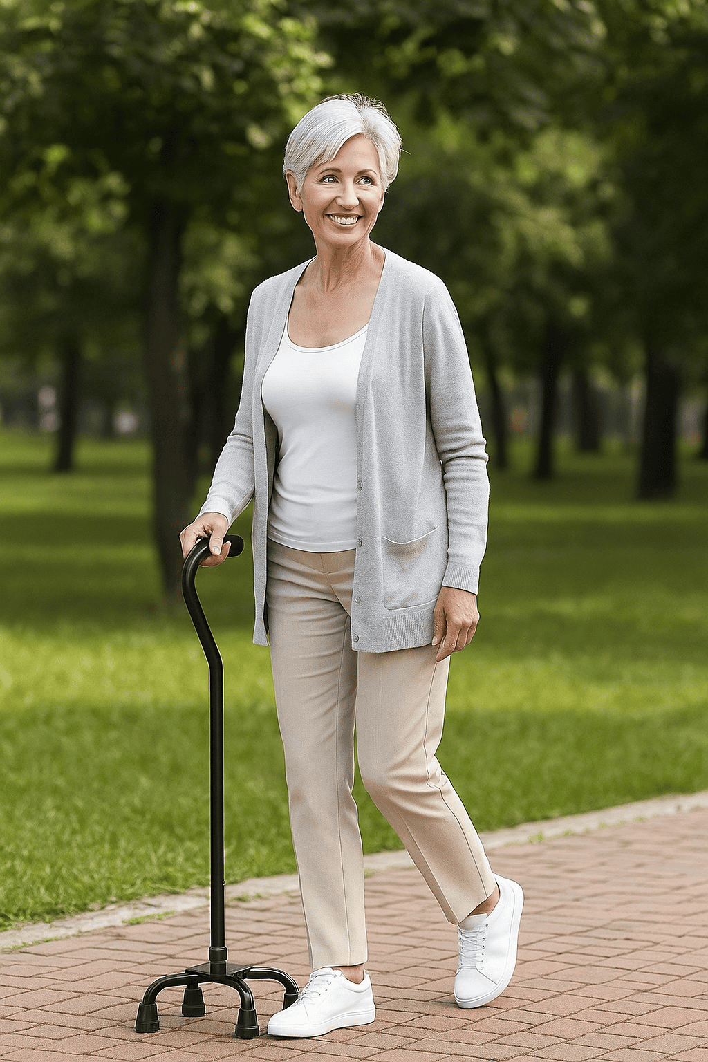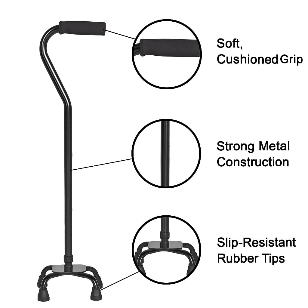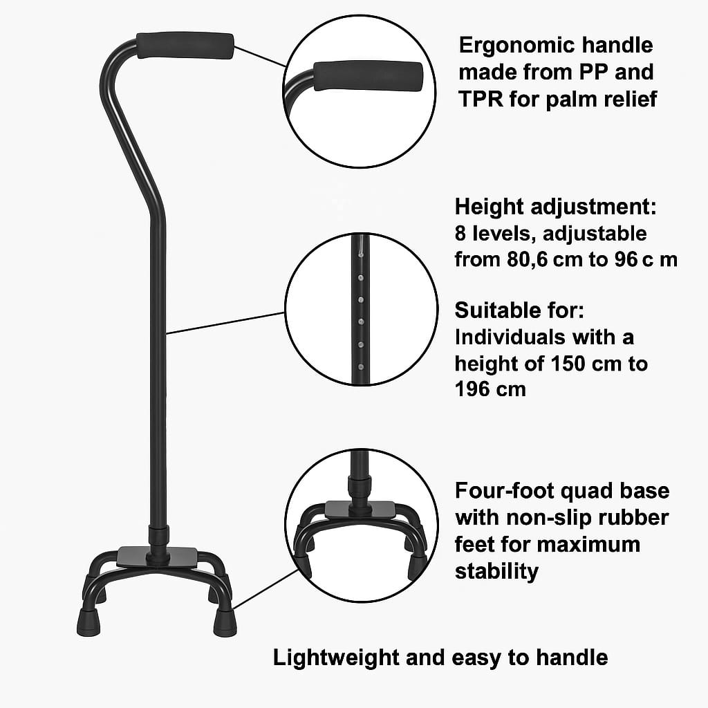 Il bastone da passeggio con quadrupli piedini di supporto è un ausilio per la mobilità ben progettato e affidabile che offre stabilità, sicurezza e comodità. Grazie alla robusta base quadrupla e all'impugnatura ergonomica che riduce al minimo l'affaticamento della mano, questo bastone da passeggio è ideale per gli anziani o le persone con limitazioni di mobilità. La regolazione in altezza su otto livelli e il design pieghevole lo rendono versatile e facile da trasportare. Offre una capacità di carico massima di 136 kg ed è adatto sia per utenti destrimani sia mancini . A casa, in viaggio o in una struttura di riabilitazione, questo bastone da passeggio offre il supporto di cui hai bisogno per rimanere mobile in modo sicuro e indipendente.