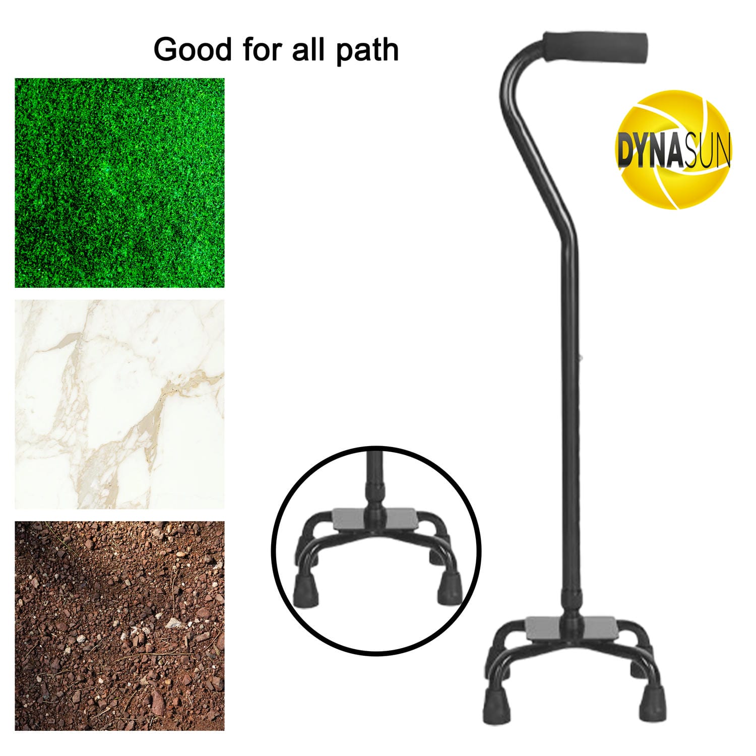 Una delle caratteristiche più eccezionali del bastone da passeggio è la sua base quadrata aggraziata e robusta. I quattro piedi garantiscono un'eccellente stabilità, riducendo al minimo il rischio di cadute e instabilità. La base dal design di nuova forma non solo conferisce al bastone da passeggio un aspetto elegante, ma garantisce anche che sia più stabile e sicuro rispetto ai tradizionali bastoni da passeggio con piedini saldati. Grazie ai piedini in gomma antiscivolo installati sulla base, la superficie di contatto con il pavimento aumenta, garantendo ulteriore sicurezza e una presa salda, anche su superfici lisce come piastrelle o parquet.