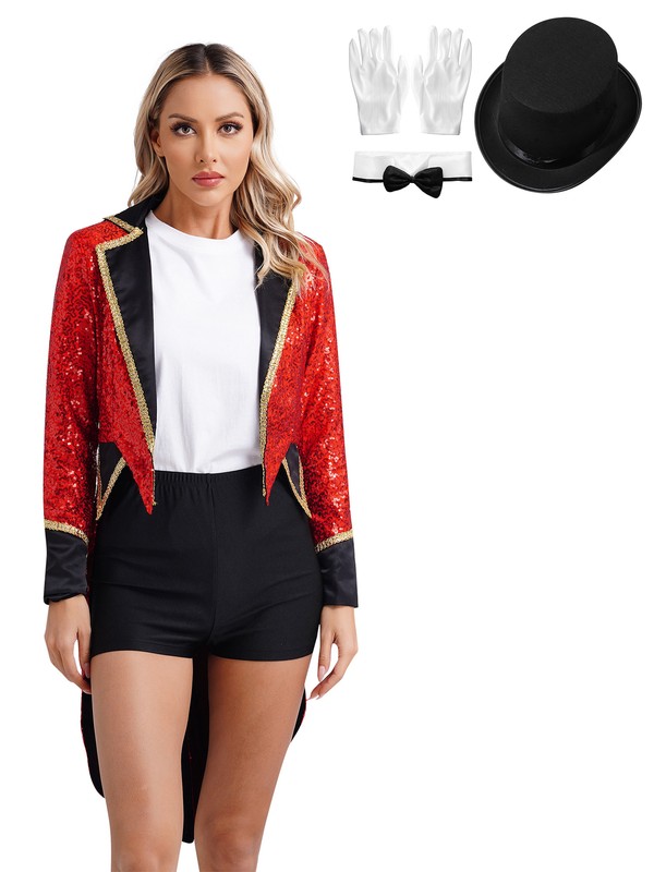 Matching fake collar is adorned with a bow tie, one hat and one pair of silky gloves to create a ringmaster and magician look.