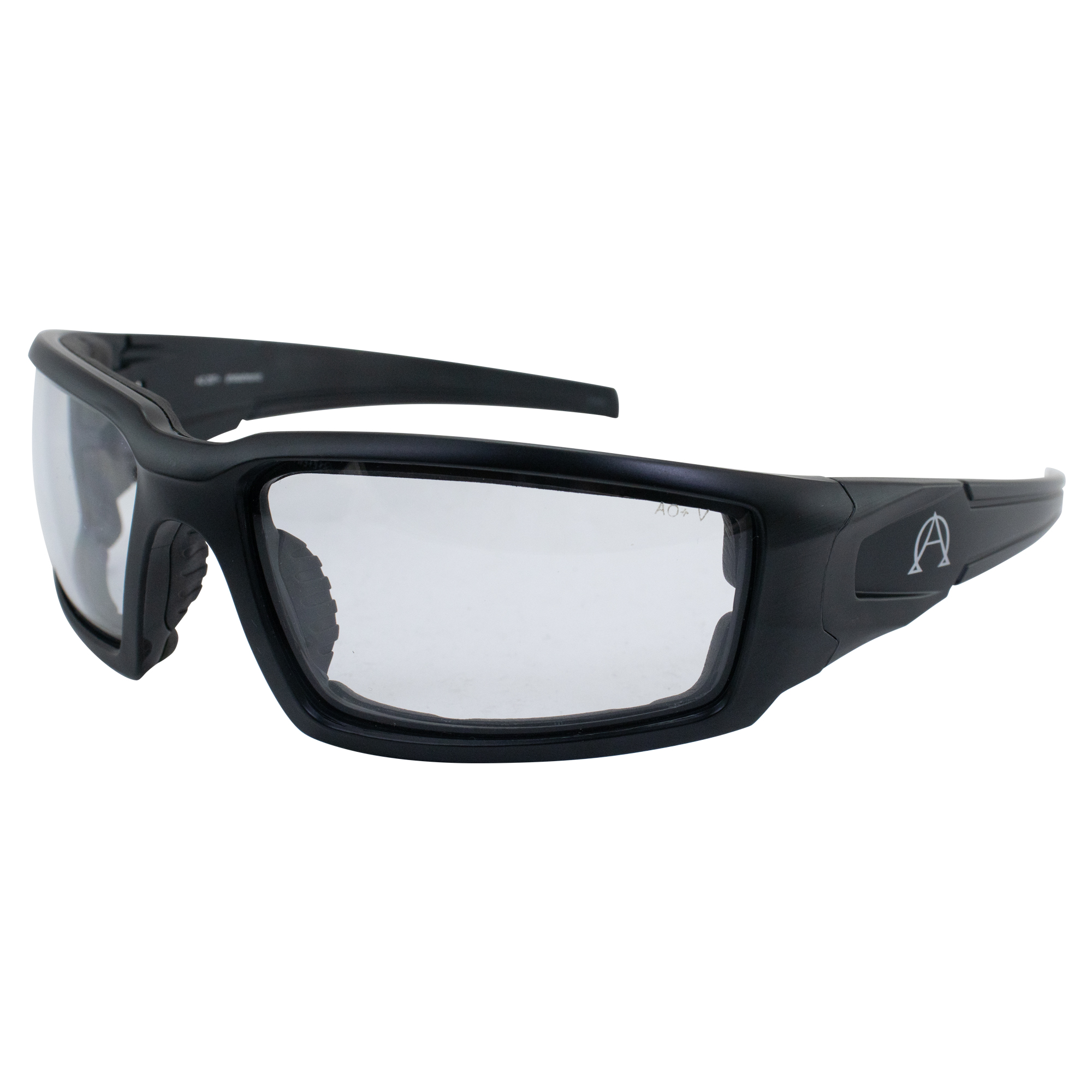 Alpha Omega 5 Photochromic Padded Riding Safety Sunglasses offer the perfect solution to all your sunglass tinting needs! You can forget about constantly switching out lenses for different conditions - these shades will provide ideal tinting no matter if you're out in strong sunlight or if the lighting is low. Just like that, no more squinting and straining your eyes in varied environments - with their clear-to-smoke tint feature, you'll easily be able to see clearly whatever the conditions. Featuring super thin vented foam designed to fit perfectly around your eyes, you can trust these sports sunglasses to stay comfortably in place throughout all of your outdoor adventures. Made with durable snap hinges and soft-touch rubber, they are as long-lasting as they look good! Plus, the lenses are super-hydrophobic so they won't fog up no matter how hot or muggy it gets outside. Whether on the dusty dirt track or the wind-whipped highway, the Alpha Omega 5 protective eyewear will help you stay focused on the next turn and head off potential danger with confidence. The lightweight PC frame ensures that your glasses won't weigh down your head, even on the longest rides. But that’s not all - these foam-padded glasses are ANSI Z87.1 Safety Rated, giving you the utmost confidence that your eyes are well protected against debris, dust, and impacts while out on the road. The clear lenses enhance clarity and improve contrast for superior visibility in low-light conditions like early morning fog or dense forests. So you won't miss out on the whole experience of your ride! They are also perfect for night riding or indoor use. The smoke lenses reduce glare and provide excellent visibility in even the most intense sunlight conditions. It also keeps vision clear by filtering out glare from headlights or street lights in low-light conditions, which ensures a safer ride. Perfect for enthusiasts, bikers, cyclists, or just anyone who likes to venture outdoors.