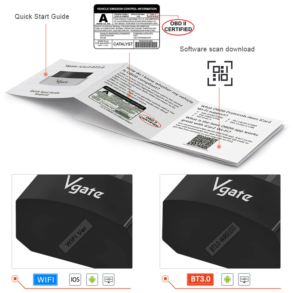 Vgate iCar3 BT-3.0/WIFI Version OBD2 Code Reader iCar3 supports OBDII protocols, this version support Android/IOS, and Windows