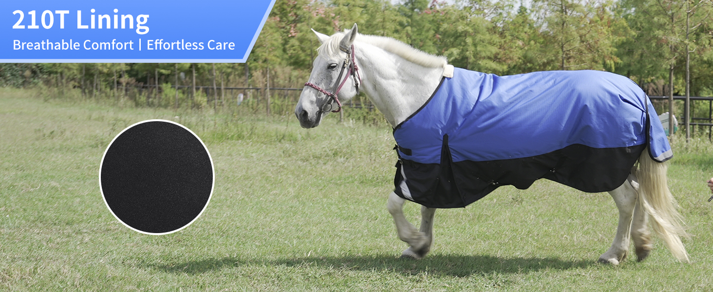 FEATURES: This horse blanket has a 210T lining made that will withstand the wear and tear of daily use. The double-stitched, taped and reinforced seems to give the blanket that extra strength and durability you would rarely find in most of our competitors. Some of the other unique features of this blanket are the removable elastic leg straps, and Dees on both sides for easy attachment of hood or neck covers.