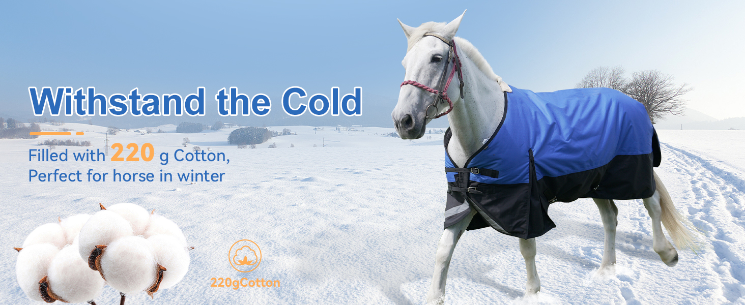 HIGH QUALITY MATERIALS: Awarded Brand for best quality and value horse blanket in the country. Durable, tough and heavy-duty 1200 denier polyester outer shell, this waterproof and breathable rip-stop material ensures top-notch performance. High-grade poly filling from the trusted our brand,with 220g filling cotton. Proprietary designed adjustable neck strap,adjustable belly strap,feflective stripe and tail flap.