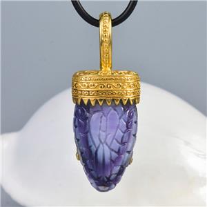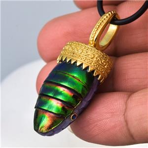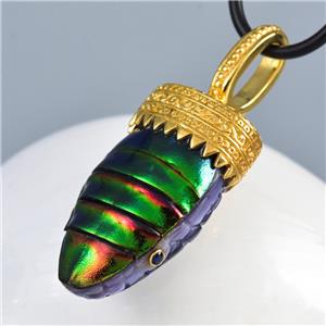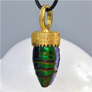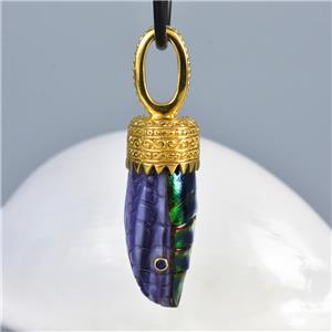 Handmade pendant with genuine natural Jewel Beetle belly, Purple Clam shell, Blue Sapphire gemstone eyes and 18K Gold Vermeil over solid 925 Sterling Silver.