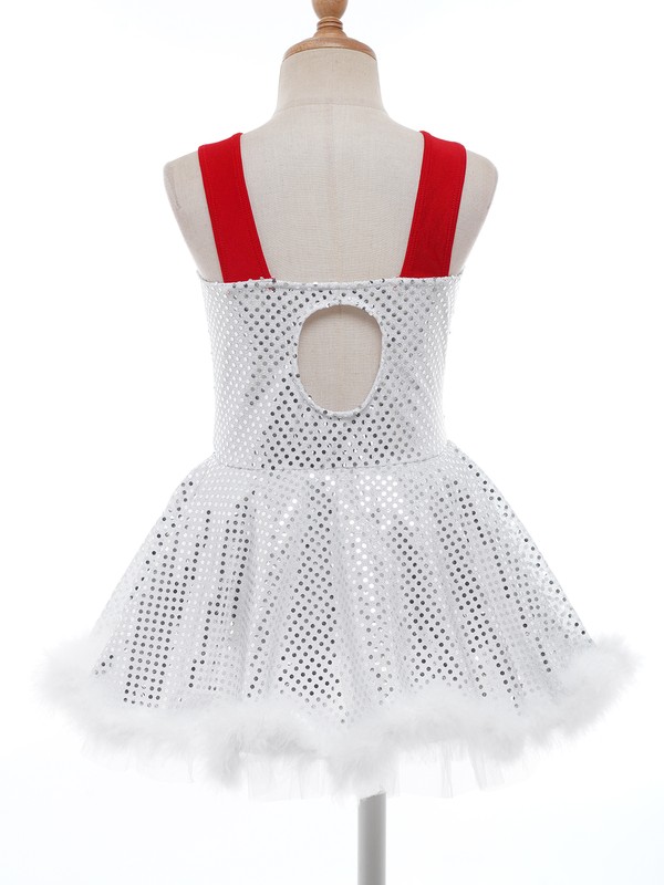 Kids Girls Ballet Latin Dance Costume Cami Dress Sequins Faux Fur Adorned Dance Leotard.