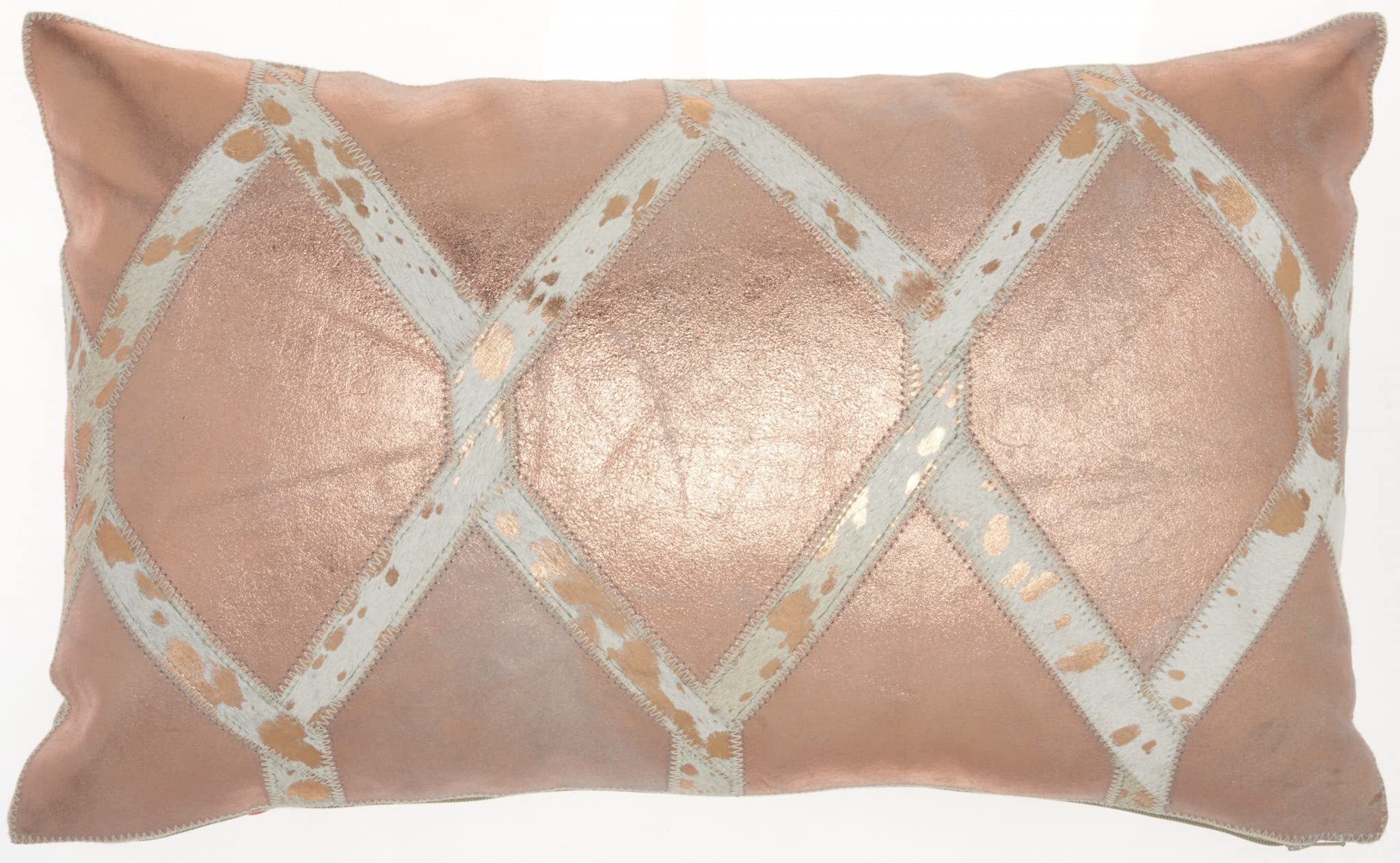 12 x 20 in. Rose Gold White Cowhide Lumbar Throw Pillow HomeRoots offers a wide variety of choices, in the tensofthousands and growing, in furniture, lighting and home decor products at extremely competitive pricing. With this glamorous Rose Gold and White Patterned Lumbar Pillow you can add a touch of classy design to any seating space in your home. This pillow has a rectangular shape and the front is covered in genuine cowhide. The diamond pattern on top has a rose gold finish on it and compliments the neutral background color perfectly. This pillow can be used to elevate the look of your bed or your couch in tandem with your existing pillow collection, or you can use it as a statement piece on your favorite chair. 5 H x 12 W x 20 D. Specifications. Color Rose Gold, White. Style Glam. Shape Rectangular. Material Cowhide. Size 12 x 20. Country of Origin India. Dimension 5 H x 12 W x 20 D. Weight 3 lbs