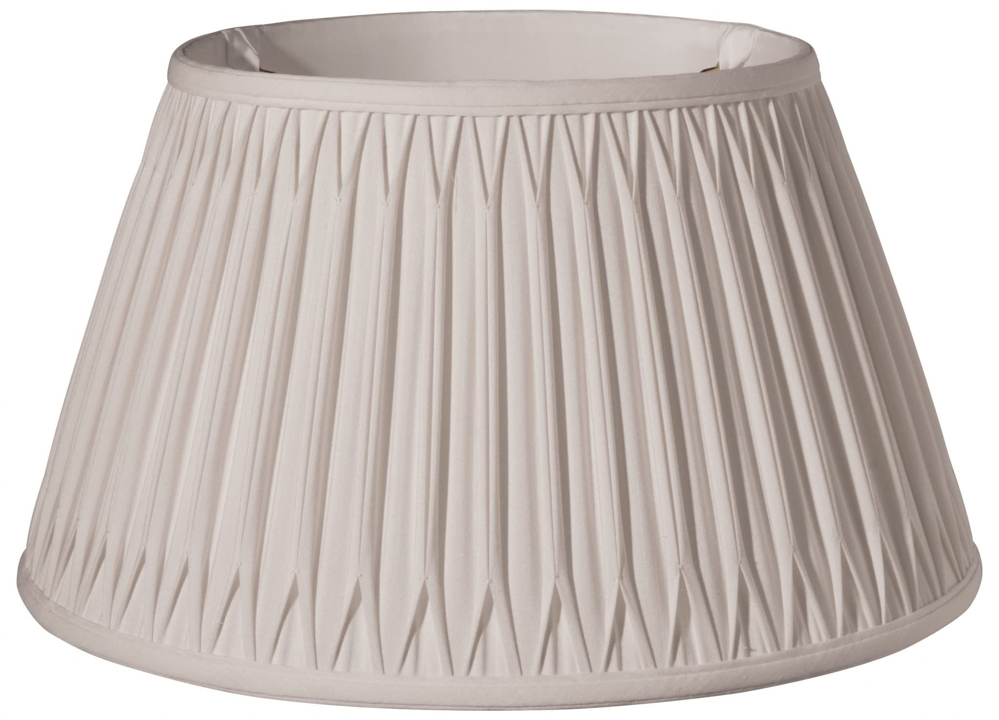 This 18 Cream Shallow Drum Smocked Shantung Lampshade has a hint of traditional flair and will be a great addition to your lamp base. This drum with double smocked pleat softback lampshade includes a washer fitter that fits over a standard harp and can be used with your existing finial design. This high quality crafted drum shape has a slight slant to give it some visual interest and is crafted of the finest shantung with a fold on top and bottom of the shade. Features. Shallow Drum Smocked Shantung Lampshade. Made from high quality materialSpecifications. Color Cream. Material Shantung. Dimension 10 x 18 x 18. Weight 5.6 lbs