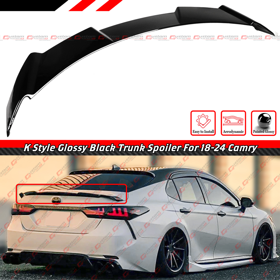 - New Released KH Style Painted Glossy Black Spoiler Wing For 8th Gen Camry All Models. Unlike The Regular Duckbill Spoiler, This Spike Up Hollow Design On the Sides Will Give You A Sleek But Unique Tail Look.