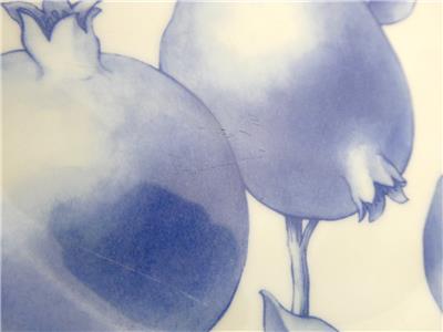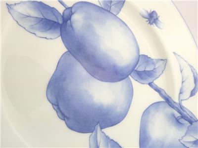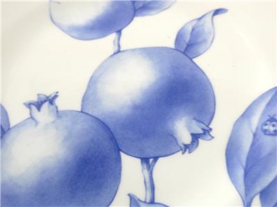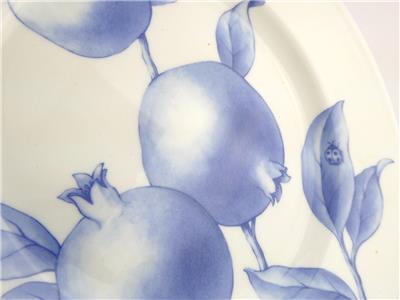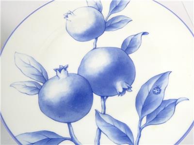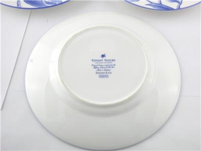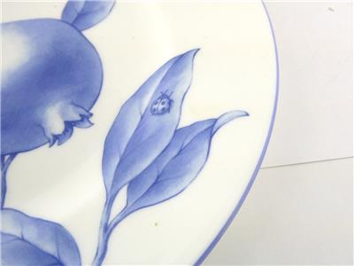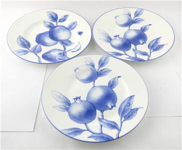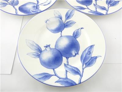 These salad plates made by Tiffany and Company feature the Tiffany Nature pattern design in blue and white- in this group there are 2 pomegranate design plates and 1 apple design plate.