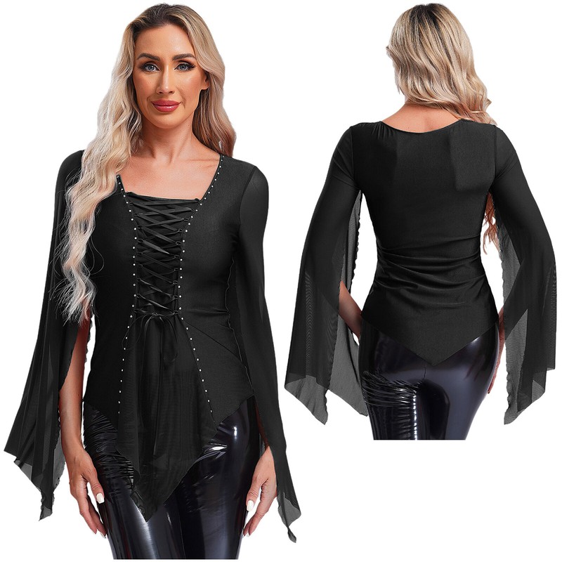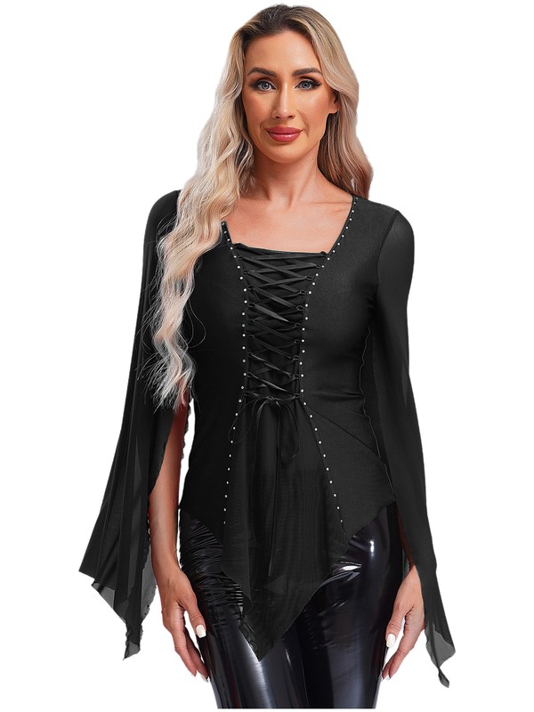 Designed with v neck, split mesh long sleeve, asymmetrical hem, mesh patchwork and lace-up at center front, rhinestones adorned.
