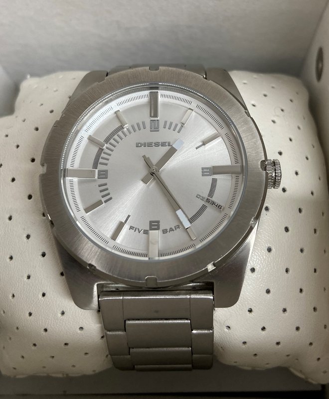Watch Information: Gender: Men's Case Size: 46mm Dial Color: Black Material Case: Stainless Steel Material Band: Stainless Steel Diamonds: n/a Movement: Analog Quartz Water Resist: 100 Meters Water Resistant Features: Analog Additional Info: Packaging: Diesel Box & Papers