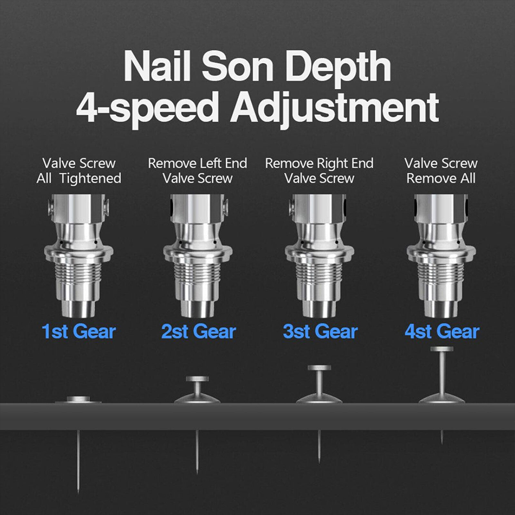 4. Power control: 4 levels of adjustment, can be adjusted according to different building requirements. Adjustable Depth Control-The adjustable depth control allows you to set the exact depth of the nail for professional results.