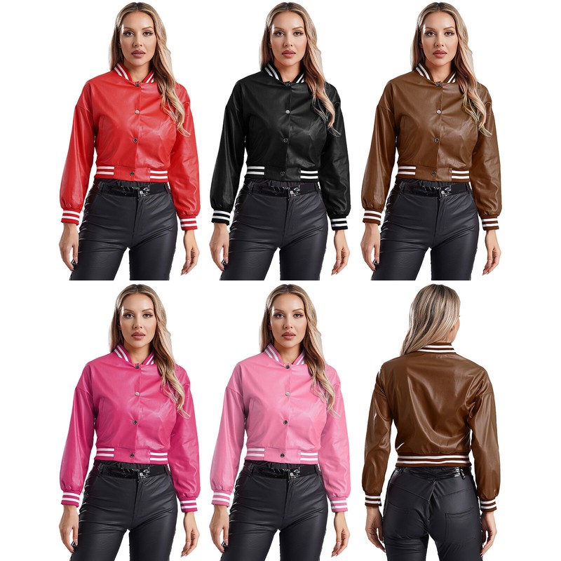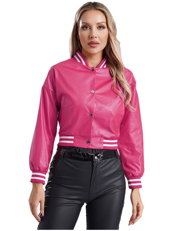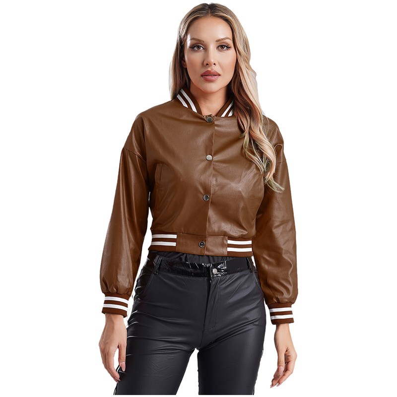 Classic baseball jacket is designed with long sleeve, striped ribbed trim, pockets, polished press button, soft lining and crop length.