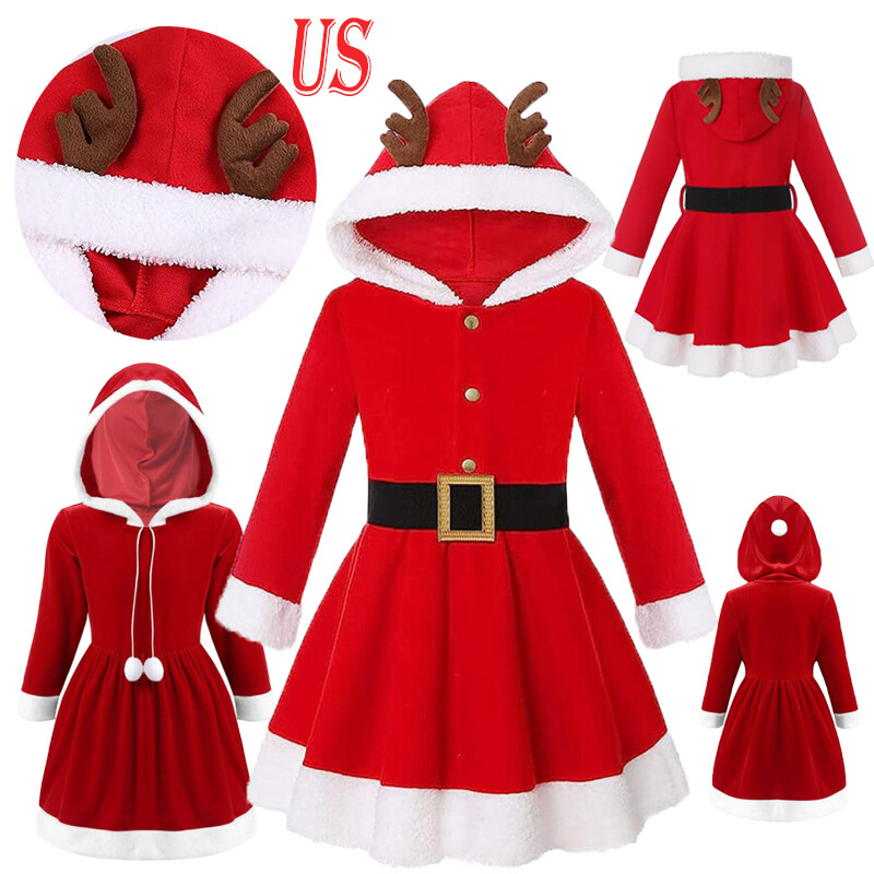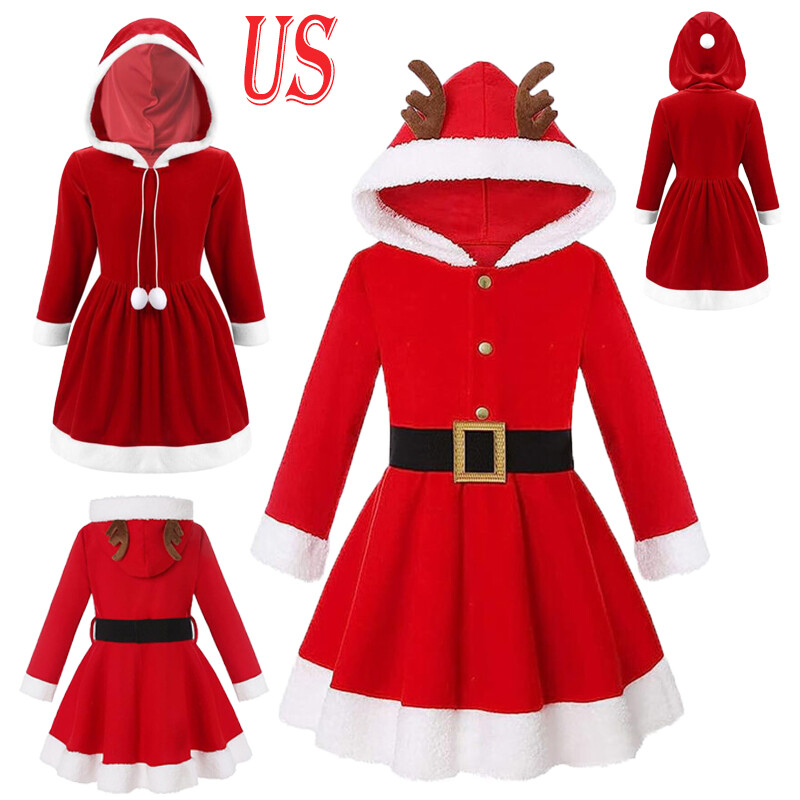 US Girls Christmas Claus Costume Long Sleeve Red Velvet Hoodie Christmas Dress
