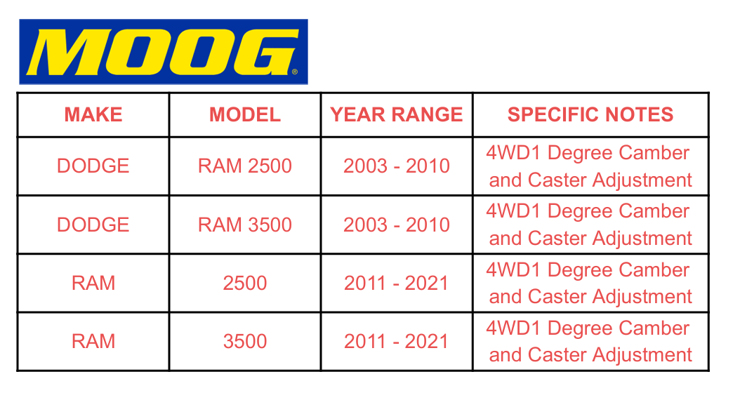 | DODGE | RAM 2500 | 2003 - 2010 | 4WD 1 Degree Camber and Caster Adjustment |