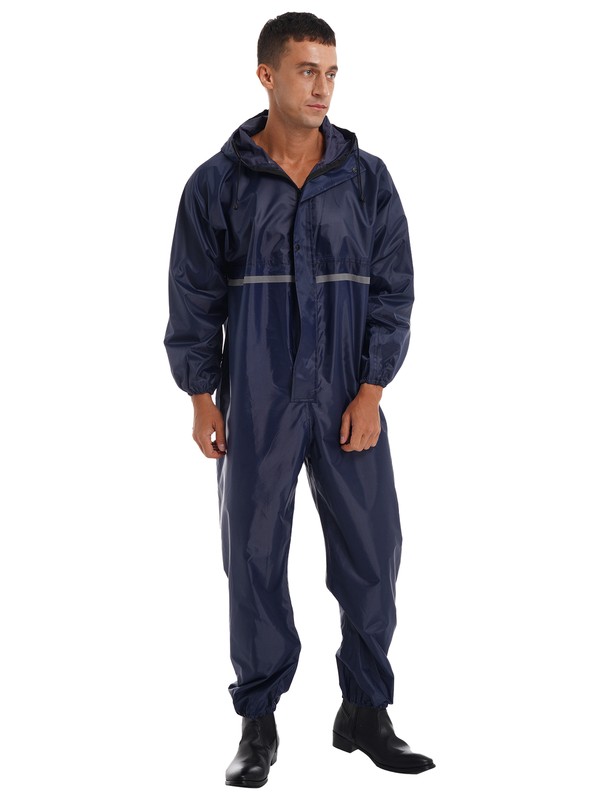 Mens Waterproof Jumpsuit Reflective Strip Rainsuit Long Sleeve Hooded Raincoat