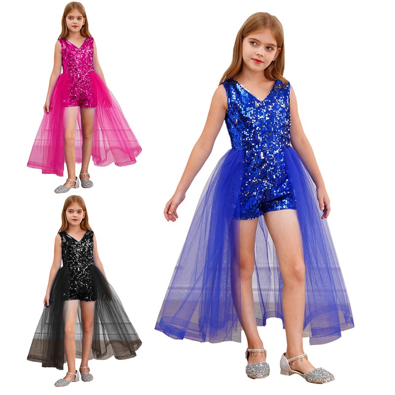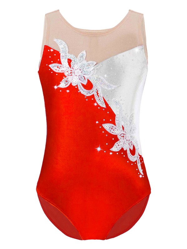 Kids Girls Sleeveless Mesh Patchwork Glittering Sequins Faux Diamonds Adorned Leotard.