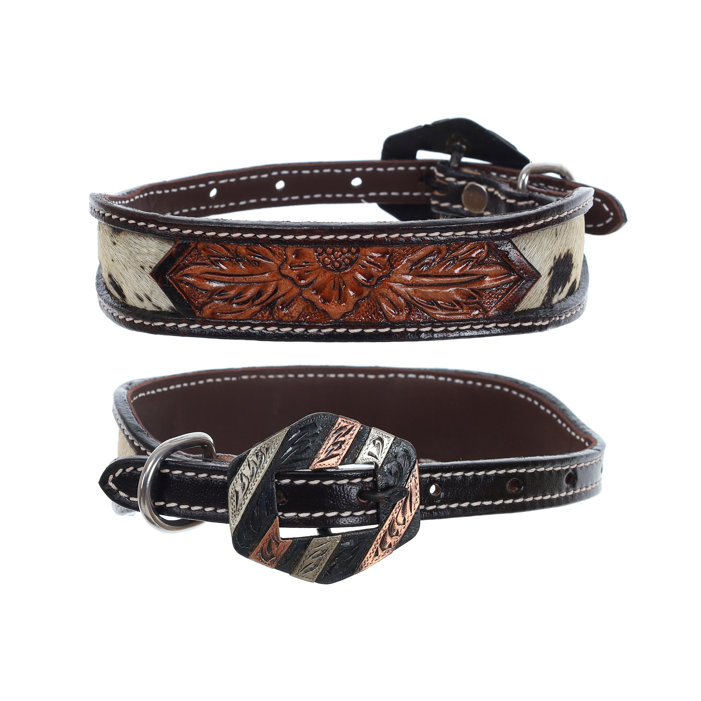 Treat your pup to a touch of Western elegance with the Showman FloraHide Leather Dog Collar! Crafted from dark-oiled leather with a beautiful cowhide inlay, this collar brings an authentic ranch-inspired look to any outing. The floral tooled accents give it a refined, artistic finish that’s perfect for adding a hint of style to your dog’s daily adventures. It's not just a collar—it’s a way to showcase your love for Western charm in a piece that’s as unique as your pup.