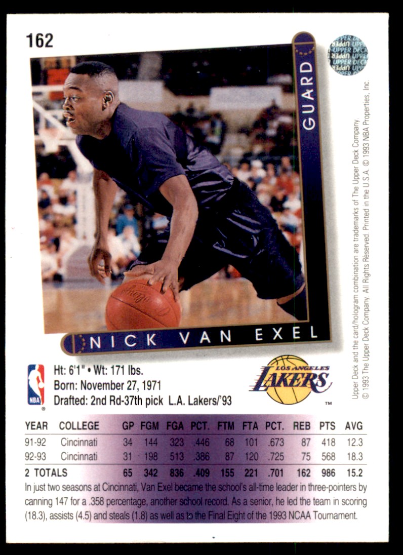 | 1993-94 Upper Deck Nick Van Exel RC Los Angeles Lakers #162 | ||||||||||||||||||